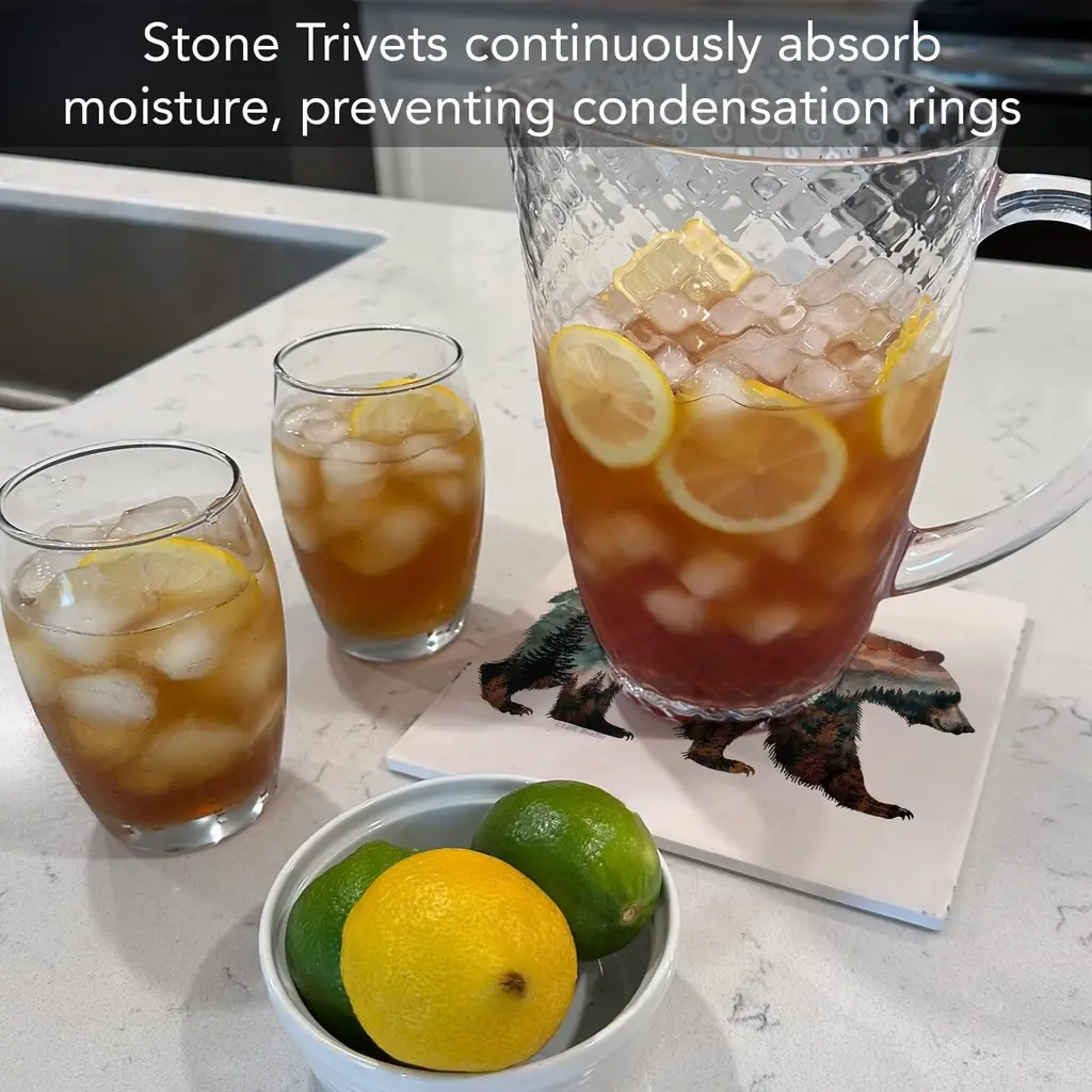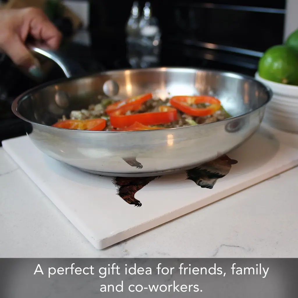 Bear Silhouette Decorative Heat Tolerant Ceramic Stone Trivet. Trivets work great to protect your surfaces and countertops from heat damage, scratches, and stains. Each Trivet measures 8” Square allowing for different sized pots and pans to be placed on them. Protect your beautiful countertops and tables from damage with these decorative trivets. Artistic design allows the Trivet to remain displayed even when not in use. Makes a wonderful housewarming, birthday, or Mother’s Day gift.