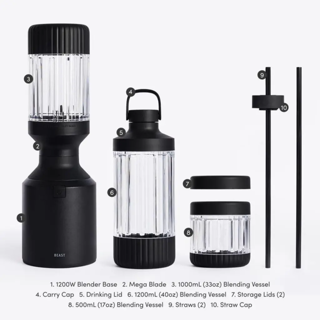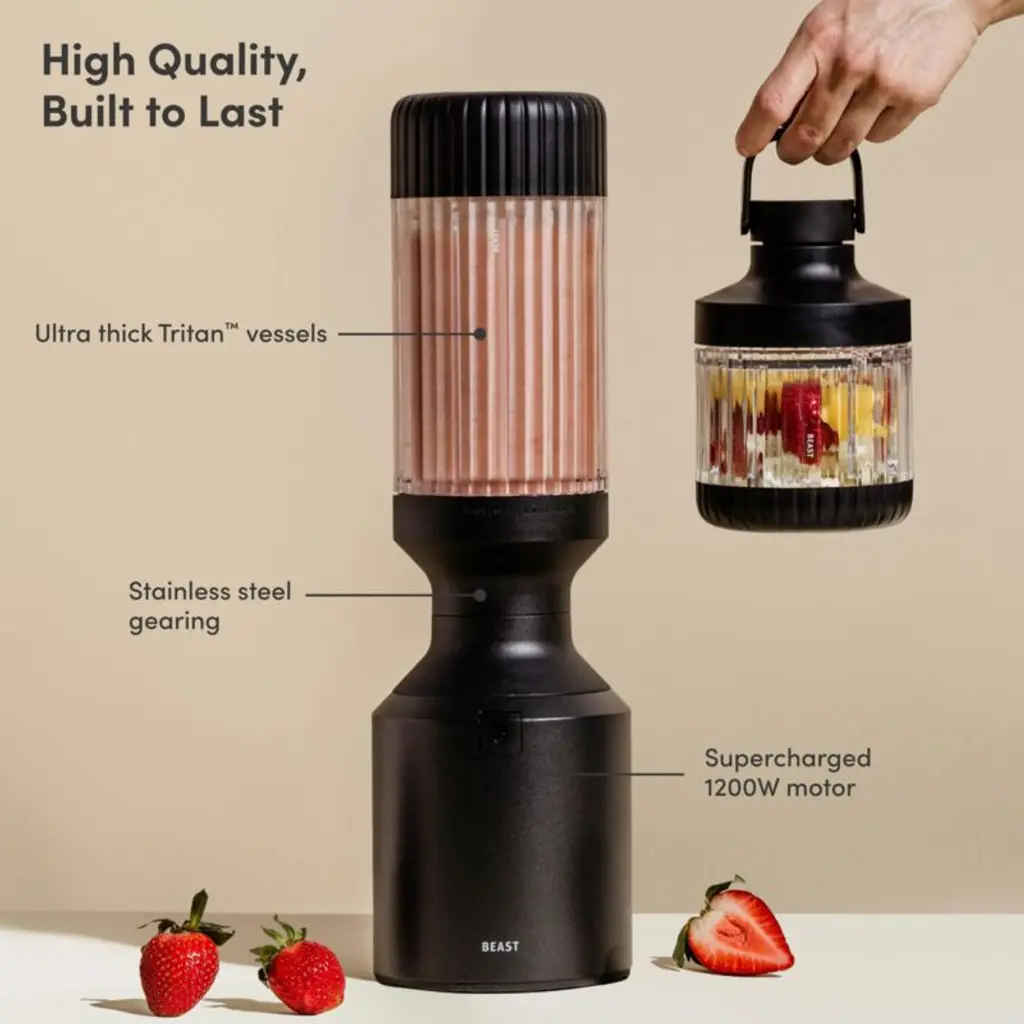 This super-sized blender makes it super easy to prepare fruit- and veggie-packed smoothies as well as smooth-as-silk cocktails, salad dressings and more. Simply load up one of three sizes of durable Tritan containers with ingredients, twist on the leakproof blade assembly, invert onto the base and blend or pulse. The blender has a ribbed design that creates internal turbulence for smoother blends and intuitively adjusts blade speed and torque as well as monitors internal temperature to avoid overheating. Once blending is done, snap on a storage lid for later use or pop on the straw cap or the drinking lid with carrying cap for on-the-go refreshment. You'll love the convenience and performance of this personal blender as well as the modern matte black finish.Need help choosing? View our Beast blender comparison chart.