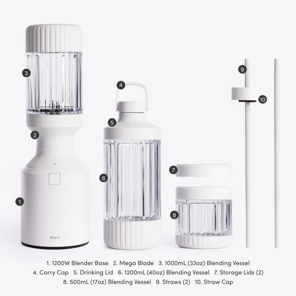 This super-sized blender makes it super easy to prepare fruit- and veggie-packed smoothies as well as smooth-as-silk cocktails, salad dressings and more. Simply load up one of three sizes of durable Tritan containers with ingredients, twist on the leakproof blade assembly, invert onto the base and blend or pulse. The blender has a ribbed design that creates internal turbulence for smoother blends and intuitively adjusts blade speed and torque as well as monitors internal temperature to avoid overheating. Once blending is done, snap on a storage lid for later use or pop on the straw cap or the drinking lid with carrying cap for on-the-go refreshment. You'll love the convenience and performance of this personal blender as well as the modern matte finish in bright white.Need help choosing? View our Beast blender comparison chart.