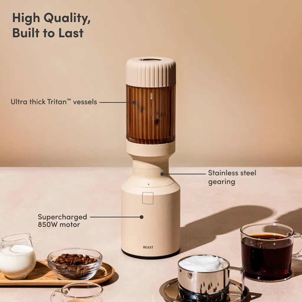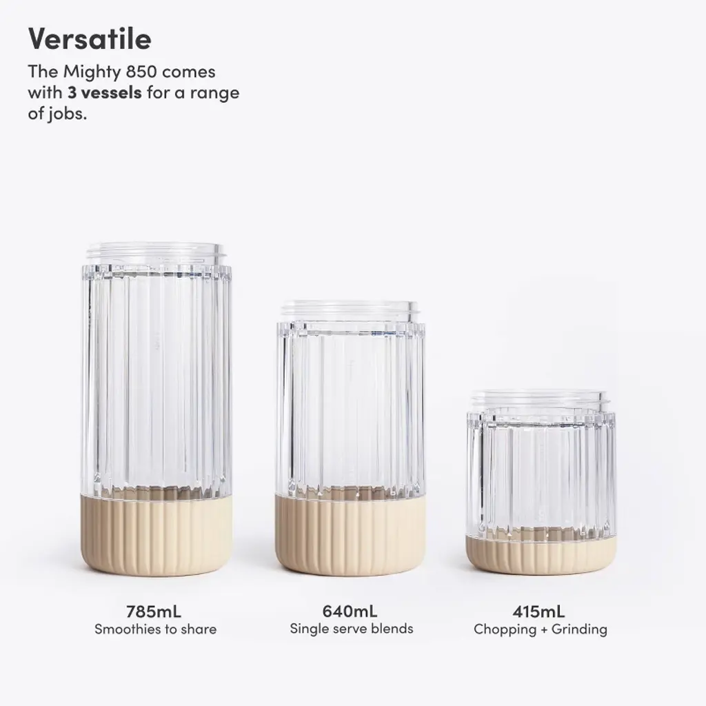 Meet the Beast Mighty 850: a premium, compact personal blender supercharged with 850W of power. It’s your kitchen swiss-army knife: your go-to blender for daily smoothies, dressings, dips, desserts, cocktails and more. With its sleek design and premium construction, this powerhouse blasts through the toughest ingredients, creating silky-smooth blends in seconds.