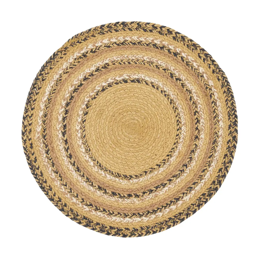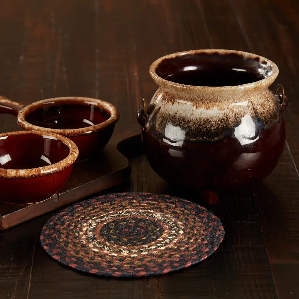 Protect your furniture in farmhouse style with our Beckham Jute Round Trivet. This 8 inch rustic table trivet is the perfect feature to stop heat from hot pots and pans from destroying a valued table or countertop. The homemade feel comes to life with the woven braided jute wool blend fabrics in brick red, dark tan, and country black and white displayed in concentric circles. These trivets are perfect for any time of the year and can also be used as the foundation for a down-home display in any room where you want that burlap farmhouse feel. It pairs perfectly with the Beckham Jute Placemats, Table Runners, and Chair Pads.QUALITY MATERIAL AND DESIGN This durable, tightly woven trivet is 80% jute and 20% other fibers; unlike 100% jute, this blend lays flatter and relaxes faster to protect your furniture from hot pots and pansPRIMITIVE STYLE Interlaced brick red, dark tan, country black, and antique white textured jute braids give you a rustic handmade feelLAYS FLAT Our jute trivet allows you to keep the rustic style while also laying completely flatSPOT CLEAN Easy to clean with a damp cloth and a mild, clear detergentVARIOUS USES Use every day on your kitchen or dining room table for family meals or create a farmhouse display on any tabletop