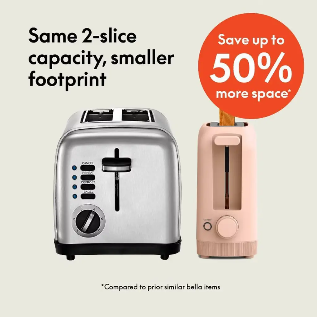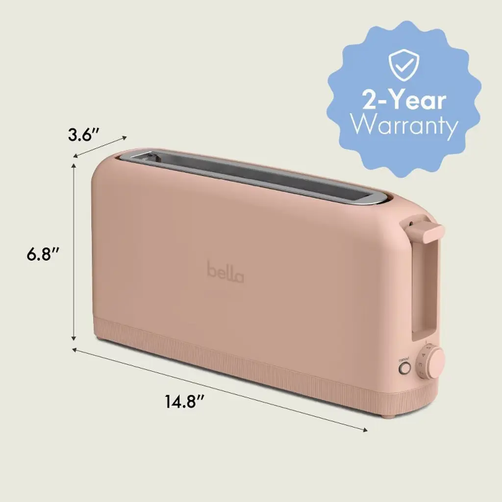 Part of our Fits-anywhere™ kitchenware system, the bella 2-Slice Slim Toaster won’t crowd the counter. With one long slot (instead of the traditional two) and a slim 3.58" profile, this toaster fits tight spaces and looks good while doing it. Plus, it serves up crisp toast in minutes. The slot fits two slices of bread side by side and is roomy enough for thick bagels, Texas-style toasts or even baguettes. Fits-anywhere™ kitchenware: Saves up to 50% more space * 10” long, wide slot fits thick (and thin) breads like bagels, baguettes and more Six shade controls with cancel functions for the perfect toast every time High-lift lever for easy access while removing smaller slices Removable crumb catcher and easy-wipe exterior make clean-up a breeze No more tangled mess–cord neatly tucks away Modern details like rounded corners, soft matte finish and subtle fluting *Compared to prior similar bella items