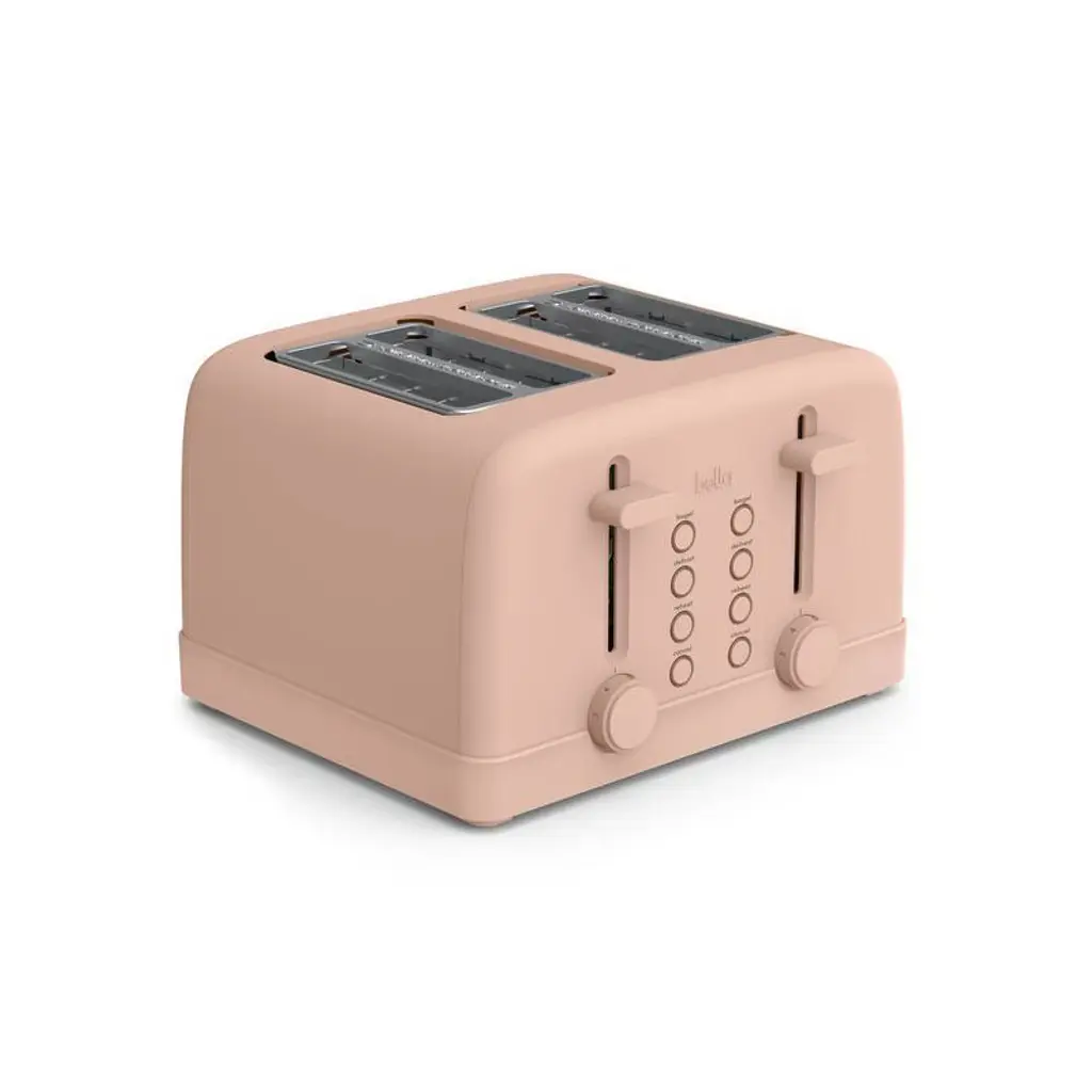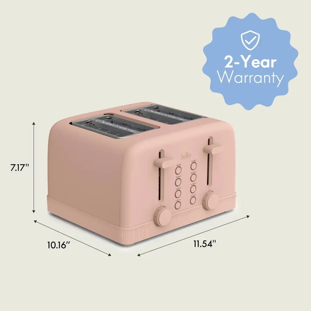 The bella 4-Slice Toaster combines traditional functionality with a sleek, modern design to perk up your kitchen counter. With extra-wide slots that accommodate a variety of bread types, including thick slices and bagels, this toaster is your new go-to. It ensures perfect, even browning thanks to precise 6-setting shade controls and has a Bagel preset for perfect toasting. It also includes a removable crumb tray for easy cleanup, auto centering guides for consistent results, and an anti-jam and auto-shutoff system for added safety.