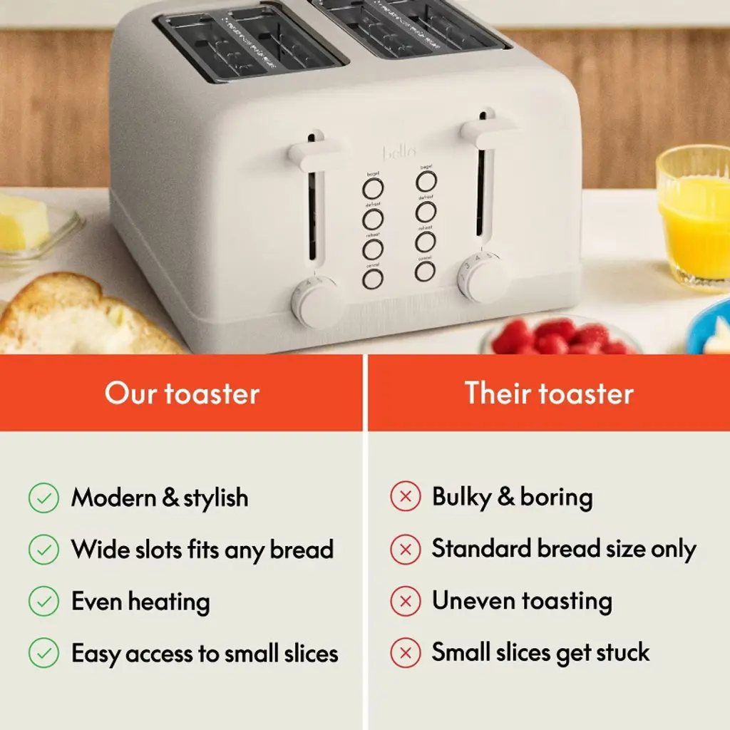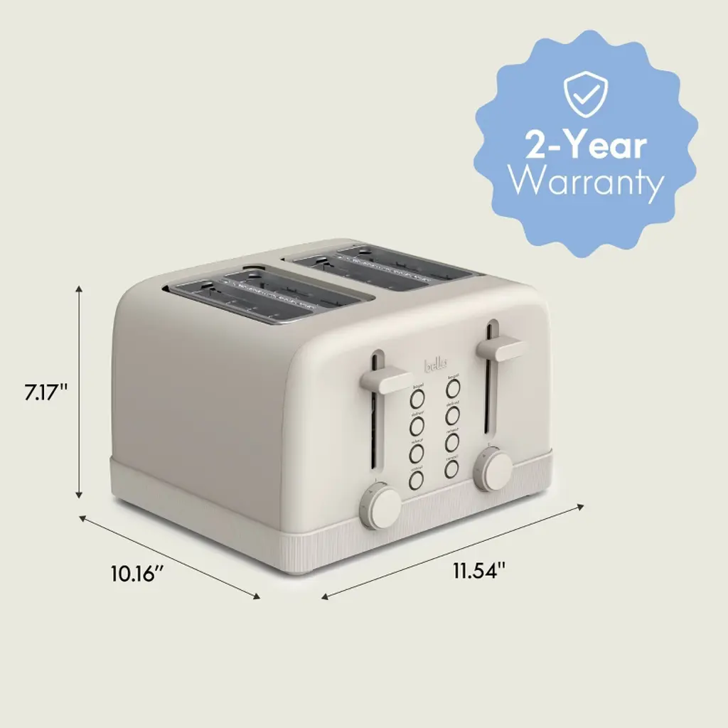 The bella 4-Slice Toaster combines traditional functionality with a sleek, modern design to perk up your kitchen counter. With extra-wide slots that accommodate a variety of bread types, including thick slices and bagels, this toaster is your new go-to. It ensures perfect, even browning thanks to precise 6-setting shade controls and has a Bagel preset for perfect toasting. It also includes a removable crumb tray for easy cleanup, auto centering guides for consistent results, and an anti-jam and auto-shutoff system for added safety.