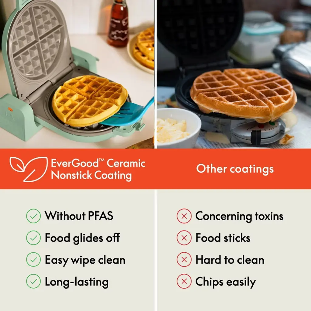 Craving fluffy, delicious diner-style Belgian waffles at home? Forget the bulky rotating waffle maker. Part of our Fits-anywhere™ kitchenware system, the bella Flip & Store Waffle Maker flips 180 degrees to evenly heat 1.5” thick waffles in minutes. When you’re done, it flips to stand for compact storage. It also features our EverGood™ Ceramic Nonstick Coating that’s made without PFAS, PFOA, PTFE, lead and cadmium for easy cleanup.