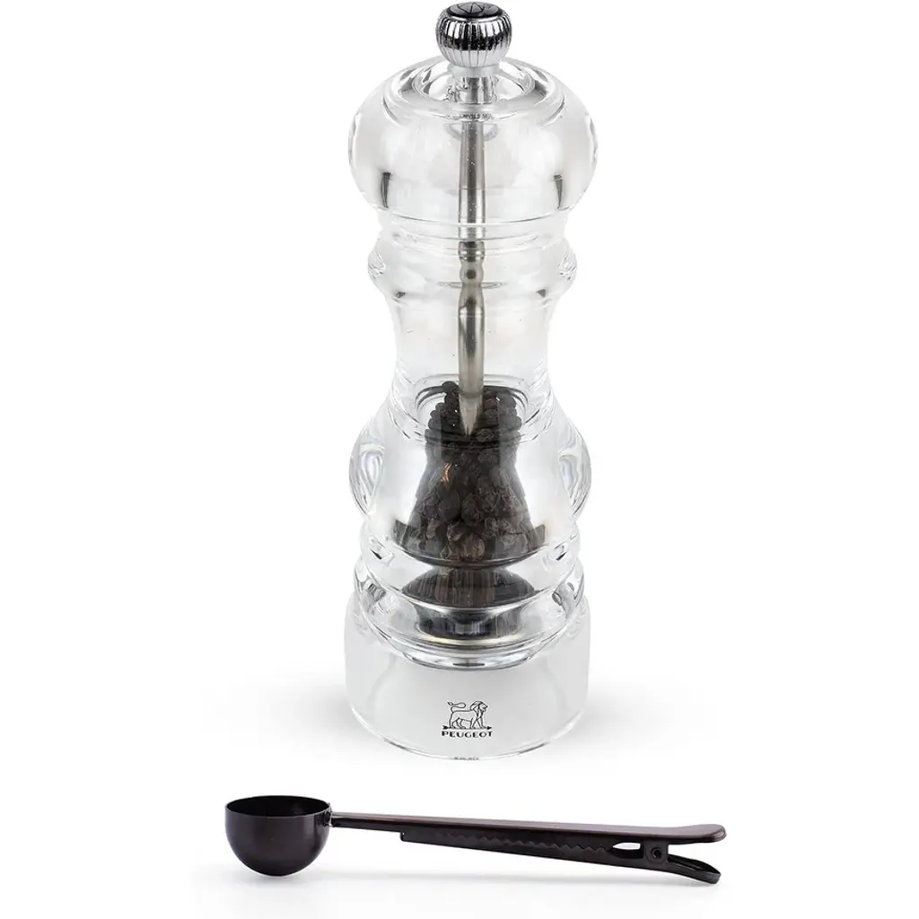 Specifically designed for grinding pepper, the pepper mill with tempered steel grinder is made from polished, painted, black nickel plated, turned and cast brass. Use only with dry, hard and whole, black, white and green peppercorns with a diameter of 5mm or less. Pink berries may be used if mixed in at a maximum of 15% with other peppercorns.