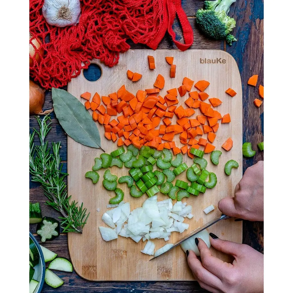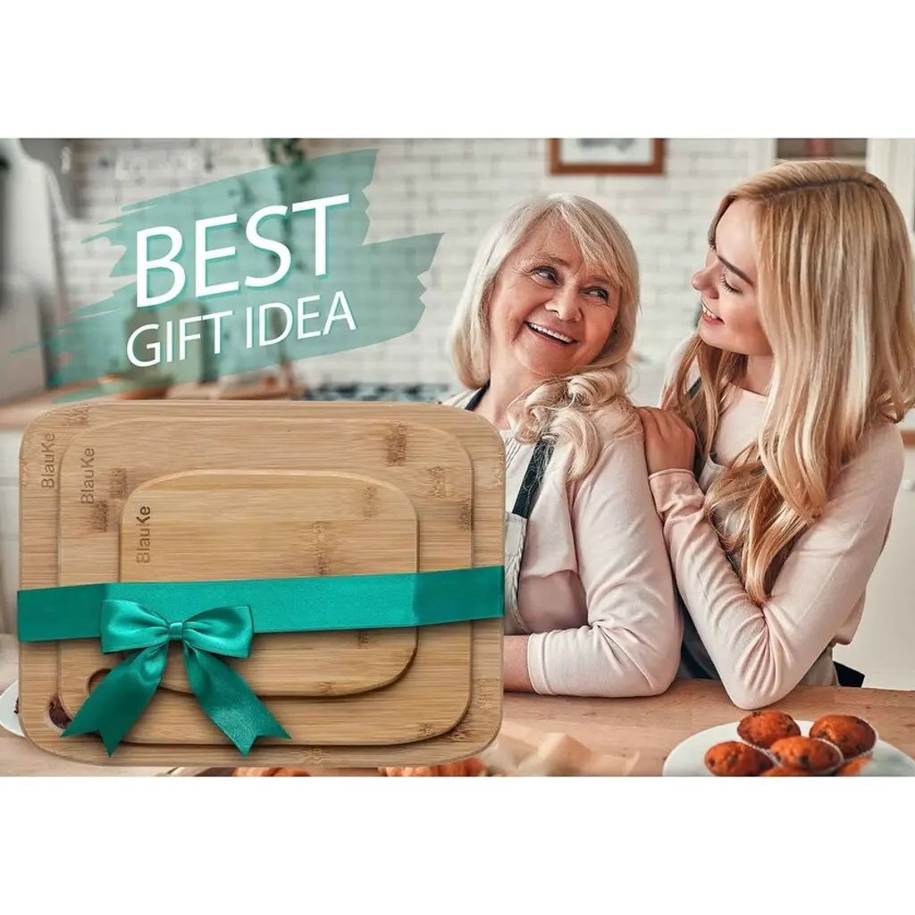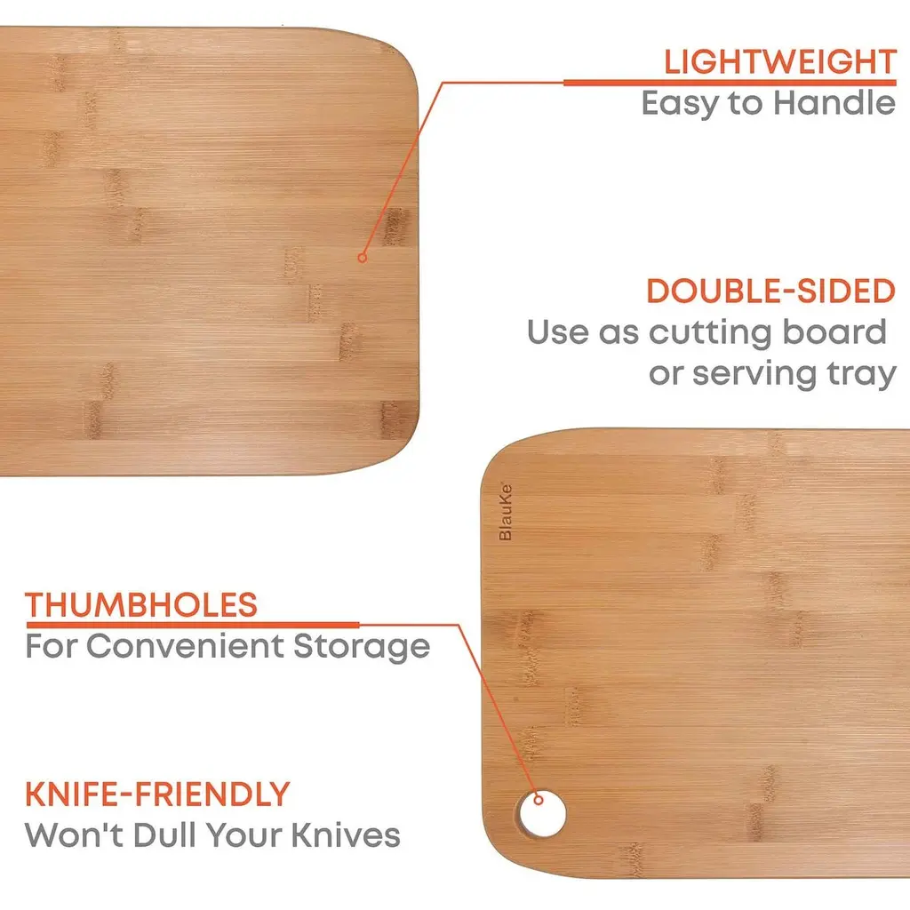 Premium Wood Cutting Boards for KitchenOur bamboo cutting board set includes 3 sizes and it's perfect for many kitchen tasks. You can use them to cut any kind of meat, fish or veggies, or as bamboo serving trays for appetizers, cheese, fruits or charcuterie. They are great as wood cutting boards for kitchen, cheese platters, or charcuterie boards.Our wood cutting boards have a smooth and splinter-free surface, so you don't have to worry that you'll get splinters (bamboo fiber) in your food.They are all-natural, BPA-Free & plastic-free.Bamboo Cutting Boards Set Includes:1 x large bamboo cutting board 1 x medium bamboo cutting board 1 x small bamboo cutting boardWood Cutting Boards Dimensions:Large Cutting Board: 13 x 9.9 x 0.4 inch (33 x 25 x 1 cm) Medium Cutting Board: 11 x 8.7 x 0.4 inch (28 x 22 x 1 cm) Small Cutting Board: 7.9 x 6 x 0.4 inch (20 x 15 x 1 cm)Features:Lightweight & Easy to StoreOur wooden cutting boards for kitchen have thumbholes for easy hanging. They are lightweight.Premium Organic Cutting Board SetWe pride ourselves on offering only natural products and these wooden chopping boards make no exception. They're made of 100% Bamboo, which is one of the most renewable resources in the world. This was harvested at full maturity and only from sustainable crops, away from pandas' habitats.Smooth and Splinter-Free SurfaceOur bamboo cutting boards have a smooth and splinter-free surface that will remain smooth even after years of using and washing.And unlike plastic alternatives, wooden chopping boards won't dull your knives, extending their service life.Double-Sided & MultifunctionalUse on both sides to chop any foods (fruits, vegetables, meat, bread), or as a wood serving board for cheese, crackers, steak or barbecue. The large cutting board can also be used as a cheese platter or charcuterie board.Knife-FriendlyOur kitchen cutting boards are gentle on the knives and won't dull them.Perfect Gift for any OccasionThis is a great gift for men, women, wife, daughter, bridal shower, etc. And it's perfect for any occasion, such as an Anniversary, Thanksgiving, wedding registry, bridal shower, Christmas holiday gifts, or as a housewarming gift for a new home.
