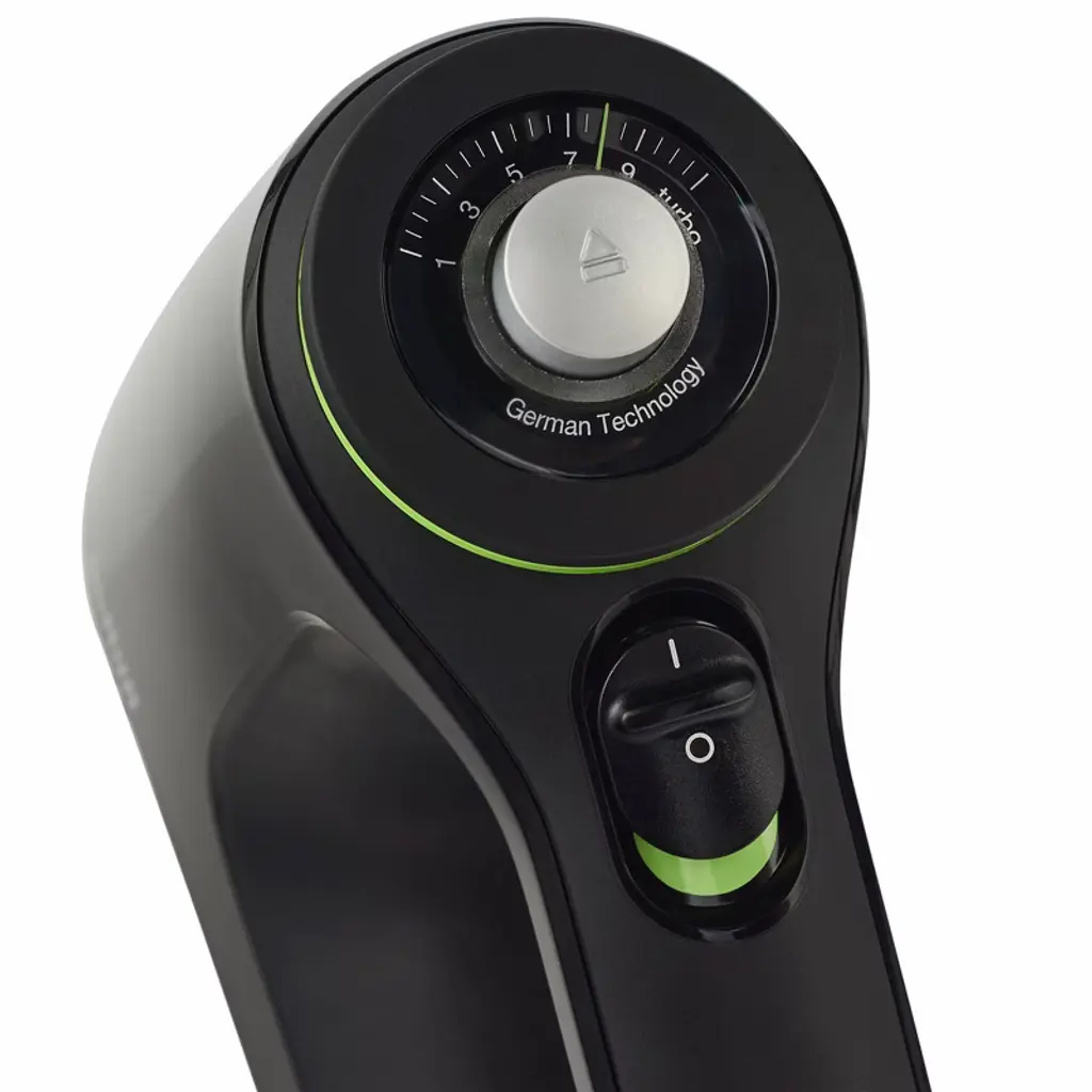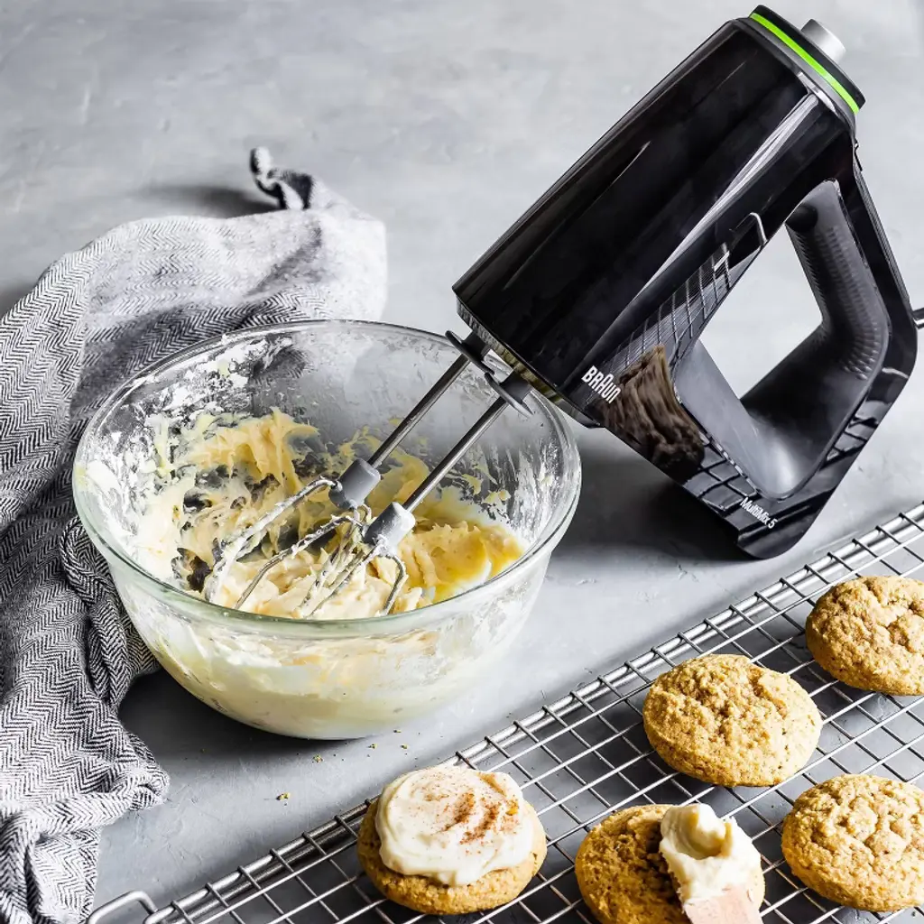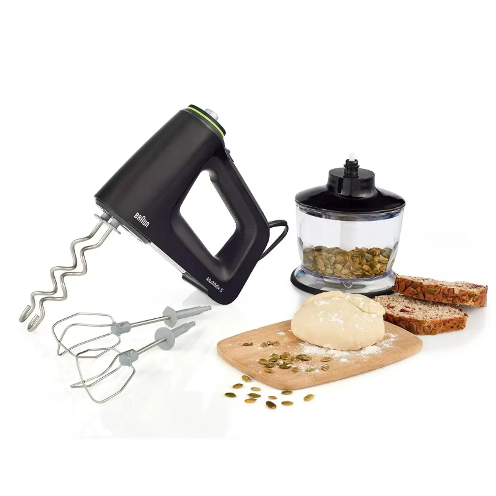 Beat, whisk and knead all the ingredients that go into your favorite recipes with the MultiMix 5 Hand mixer, model HM5100. A 350-watt motor delivers 50% more power* than leading competitors to combine even the toughest ingredients for well-mixed results. SmartMix technology incorporates an in-line vertical motor design that redistributes the weight of the mixer out of your hand and into the bowl, requiring 50% less effort* for mixing. The completely sealed system and sleek design has no open ventilation slots so nothing can get inside the housing, resulting in quick, easy cleaning and long-lasting performance. With 9 speeds to choose from — and Turbo for the toughest jobs — a simple turn of the VarioControl speed dial with your thumb is all it takes to seamlessly fine-tune the speed for precise mixing results. No need to stop and change attachments to go from whisking to beating. The unique MultiWhisk attachment is both whisk and beater in one. Its dual-action design creates volume for light, airy mixtures. Ready to bake some bread? This powerful mixer and included dough hooks are up to the task. With the signature Braun design and engineering, this lightweight hand mixer with soft-grip handle is slip-resistant, keeping you comfortably in control. All that’s left to do is unplug the extra-long cord, pack the pieces into the accessory storage bag and let the baking begin. *Wattage and mixing effort (mixing cake batter, external tests) compared to leading competitors.