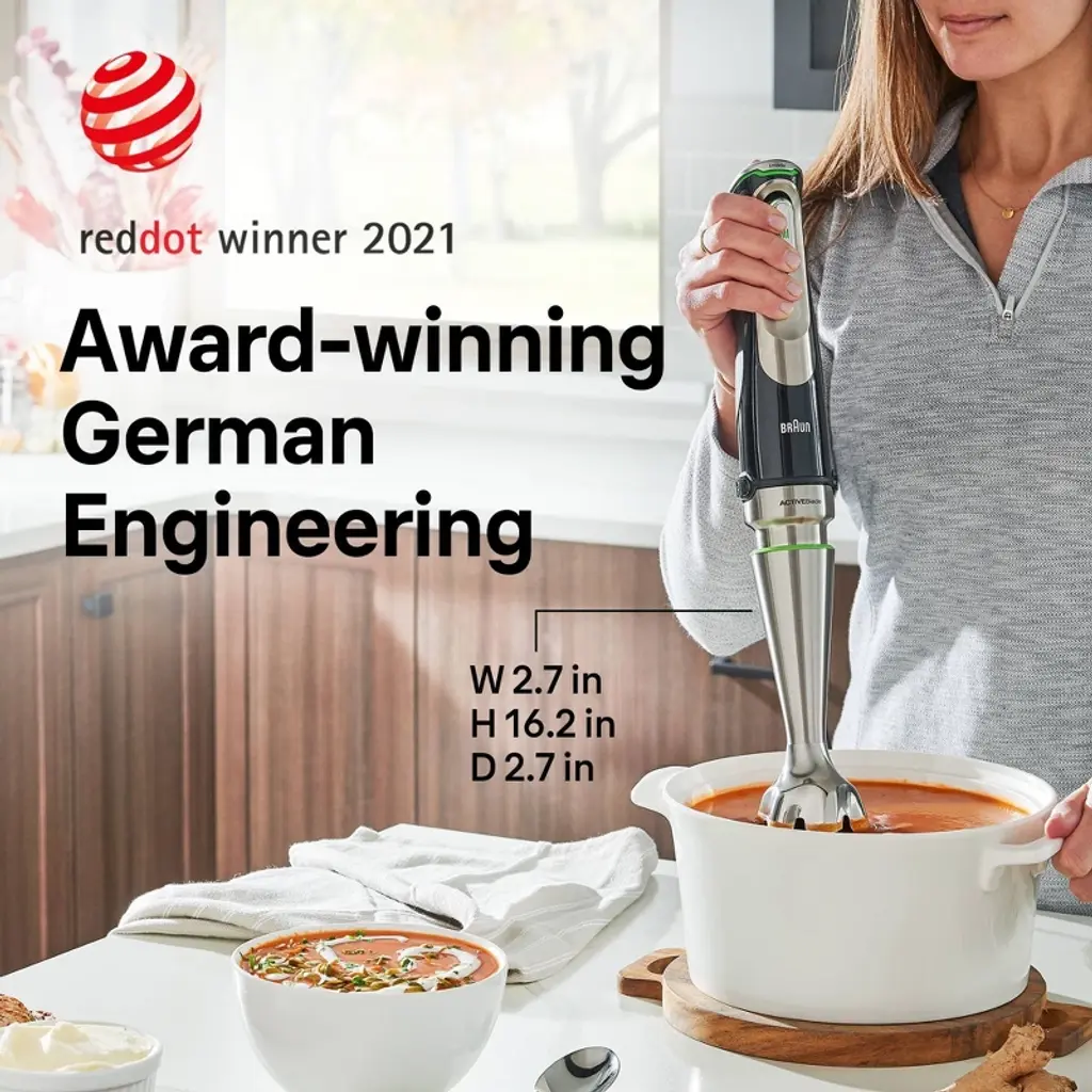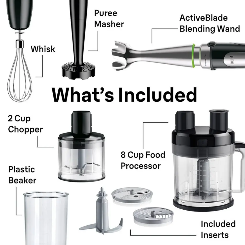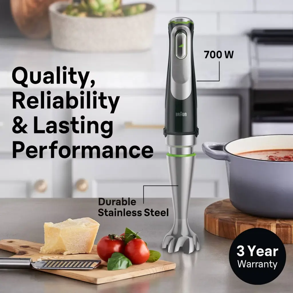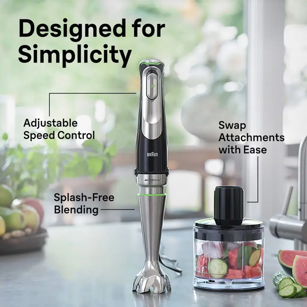 The MultiQuick 9 is Braun’s best performing and most powerful hand blender yet. It now features Active PowerDrive Technology, with its high-performance 700-watt motor that results in up to 40% faster performance*. The new MultiQuick 9 is equipped with a wide range of new, cutting edge features like the imode Technology, which lets you create even more precise results at the push of a button. One can choose between 3 speed modes - from pulse, low speed and high speed to customize your blending power into practical speed ranges for different tasks. Low speed mode limits the speed range, which allows you stay in a power zone optimized for soft ingredients and slicing and shredding. In the high speed mode, the full speed range of 700 watts is available for high speed blending and tougher ingredients. And pulse automatically delivers evenly chopped ingredients without smashing. The blending wand with ActiveBlade Technology moves up and down to easily turn the toughest ingredients into the most delicious creations. Finally, the MultiQuick 9 is introducing new attachments in addition to all the existing ones. With the EasyClick Plus attachment system, you can easily swap accessories for the ultimate convenience and versatility. The brand-new XL 8cup food processor includes kneading tool, in addition to a chopping blade, 5 slice and shred discs and a French Fry cutting blade. Continue cooking with the whisk, masher, 1.5c chopper attachment and beaker also included. It’s one hand blender with an array of innovative attachment solutions for the world’s largest attachment system unrivaled in versatility. *Compared to Braun MQ500 on pesto.