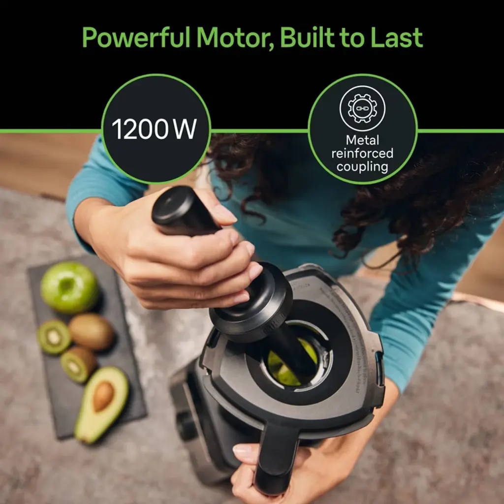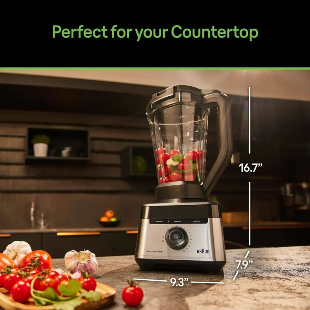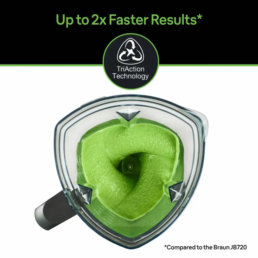 The latest Braun TriForce Power Blender will be a staple in your kitchen for an effortless personalized blending experience. It features a TriAction technology jug, designed with a triangular shape. This sophisticated engineering guarantees 60% finer and 2x faster blending*. The seamless interface makes it easy to quickly master recipes thanks to the iTextureControl functionality. Simply select any one of the 3 automated programs to start – Smoothie, Ice Crush or Chop, then choose between one of 3 unique texture settings – smooth, medium, or coarse - for 9 possible blends as precise as your palate. The blender’s innovative technology is supported by 1200 watts of continuous power and premium stainless steel blades. The sharp PrecisionEdge Blades effortlessly emulsify the toughest ingredients like hearty root vegetables and dense chunks of ice, ensuring everything from silky smoothies to savory spreads is equally enjoyable; while the durable motor system also offers 10 manual speed settings plus a pulse function to bring every foodie craving to fruition. The easy-to-use control panel is a simple wipe clean surface when you’re finished. Clean up is quick with a dedicated auto-clean program. With the included 3 year warranty, it’s easy to see why the innovative Braun TriForce Power Blender is the accomplished culinary sidekick your kitchen’s been searching for. *Compared to the Braun JB7201.