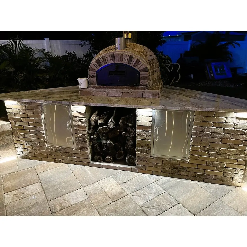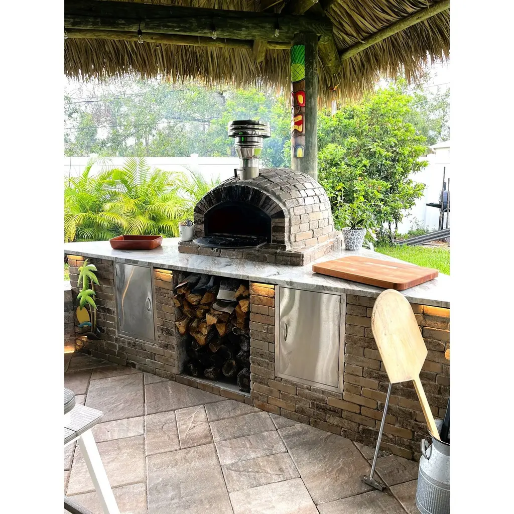 The Buena Ventura Pizza Oven: Unmatched Elegance & Functionality:The Buena Ventura Pizza Oven is a masterpiece of design and craftsmanship, featuring a stunning cast stone façade in a warm, authentic Portuguese Sienna sandy tan brick tone. The stacked stone appearance enhances its timeless appeal, perfectly complementing any outdoor space. With a traditional dome shape akin to the Pizzaioli's, this oven stands out with its wider opening and efficient heat conduction, making it perfect for authentic Italian pizzas cooked in just 90 seconds!Why Choose the Buena Ventura Pizza Oven?Double the Deliciousness: Cook up to two 12″ pizza pies simultaneously.Versatile Cooking: Beyond pizzas, this oven is perfect for roasting chicken, veggies, casseroles, desserts, bread, and more!Complimentary Ceramic Dish: Every oven includes a Portuguese ceramic baking dish, ideal for creating your culinary masterpieces.Superior Quality & Handmade Excellence:Unlike clay ovens, our ovens are made with authentic brick for superior durability and performance. Handmade in Portugal, each oven is triple-insulated for optimal heat retention:Inner Layer: Authentic fire brick and mortar.Middle Layer: Our internationally patented Rockwool Insulation, secured with metal batting.Outer Layer: High-performance refractory cement.This triple insulation ensures the oven exterior stays cool to the touch while the interior reaches optimal cooking temperatures.Premium Hardware Built to Last:Non-Rust Cast Aluminum Door & Chimney Cavity: Durable and designed to withstand the elements.Stainless Steel Chimney: Ensures proper ventilation for perfect cooking results.High-Heat Viewing Window: Monitor your food effortlessly.Customizable Design:Personalize your oven with high-heat paint or tiles to match your outdoor decor. We recommend curing your oven and treating it with Ultra Fire (included) before painting.What’s Included in Your Oven Package?Premium Door: Cast aluminum with stainless steel chimney (6" high spout with flu/damper). Optional extensions and cap available.Ceramic Baking Dish: (10” x 14.5” x 3”) – perfect for versatile cooking.Thermometer: Measures 0-500°C for precise cooking.Ultra Fire Patch Kit: Address superficial cracks with ease.Specifications:Exterior Dimensions: 39" W x 26" H x 39" DInterior Dimensions: 30" W x 15" H x 32" DDoor Dimensions: 19.7" W x 10.6" HChimney Dimensions: 5.5” W x 6” HWeight: Approx. 1250 lbsDurability You Can Count On:Protect your oven from rain, snow, and harsh elements with our all-weather covers, available on our accessories page. With proper care, your Buena Ventura Pizza Oven will provide years of culinary delight.