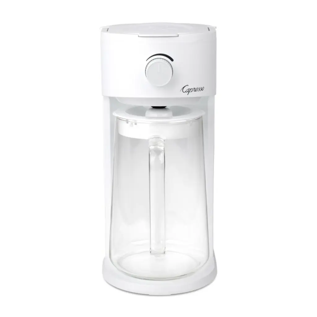 Dedicated to home-brewing the best iced tea from loose-leaf or bags, the electric Capresso iced tea maker in bright white easily adjusts the brew strength from mild to strong to enhance the flavor. The industrial-strength borosilicate glass pitcher is topped with a white spouted lid for neat pouring.