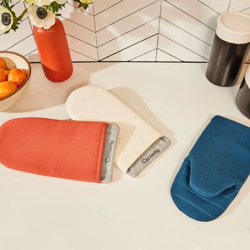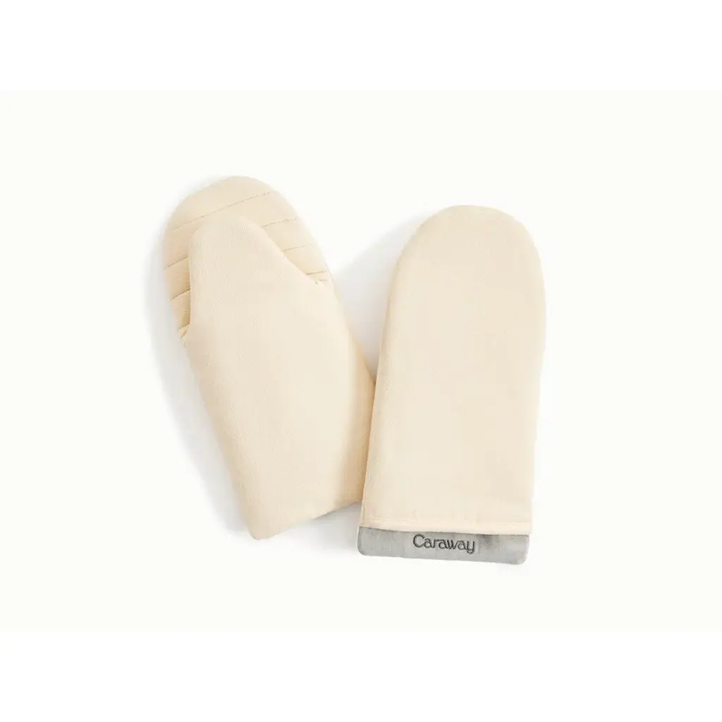 Designed to coordinate with Caraway cookware, this set of two oven mitts protects hands when removing hot pots and pans from the stove or oven. Made of organic cotton in cream with grey contrast trim, the quilted mitts are amply padded for a comfortable, heat-resistant grip.
