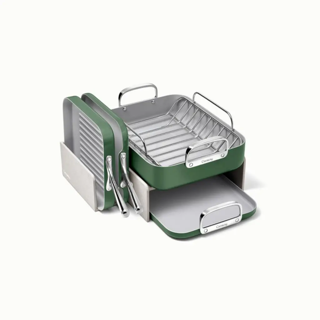 You'll be smitten with this beautifully designed cookware set that's as amazing to look at as it is to cook with. Featuring a minimalist squared-off design with stainless steel handles and sage green exteriors, the pans are a joy to use. The non-stick ceramic coating provides superior non-stick performance, while the aluminum cores conduct heat efficiently. The versatile setgrill and griddle pans, double-burner griddle and roasting pan with rackmakes a fabulous wedding, graduation or housewarming gift. To keep things orderly inside kitchen cabinets, the squareware set includes two organizers that corral all of the components.