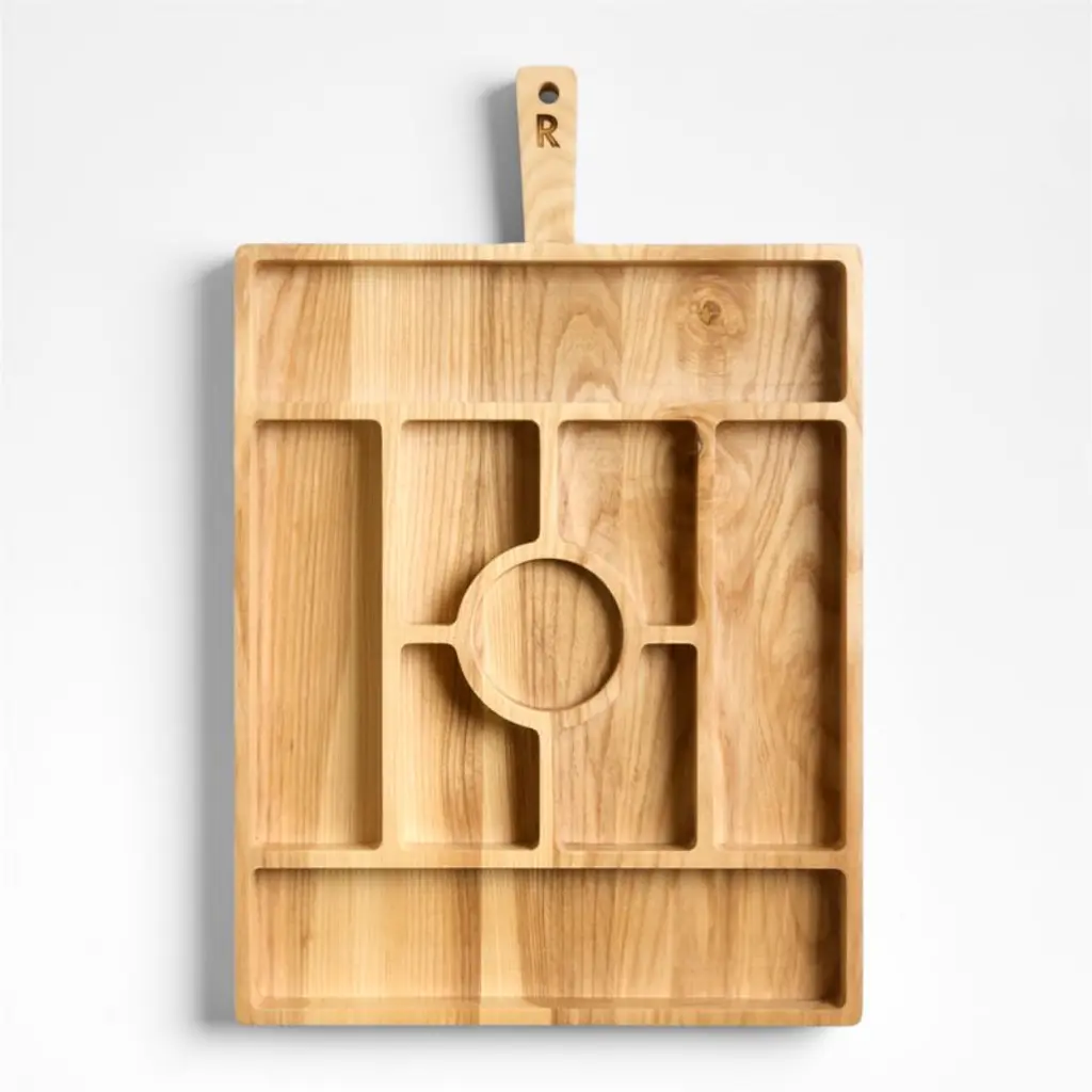 Divided into nine sections, our Carson serving board partitions ingredients for the well-organized cheese or charcuterie platter. Made of solid ash, the partitioned wood board shows off its lovely grain, while providing separate compartments for crackers, fruit, salume, cheese, nuts and olives. A handle facilitates transport of the large square board from kitchen to table.By choosing FSC®-certified products, you are supporting responsible management of the world's forests.
