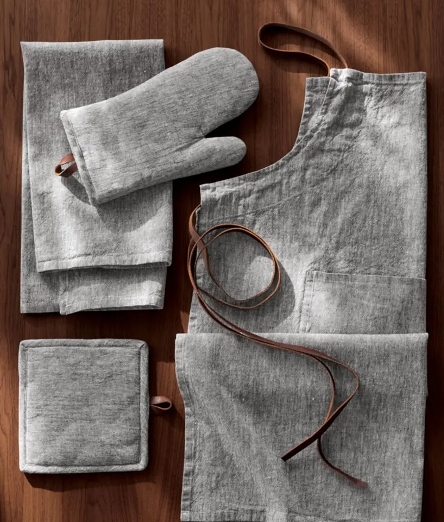 Our classic grey oven mitt combines the great look of chambray with a natural leather hanging loop. Enzyme washed for softness, the blend of linen and organic cotton will soften even more with washing. Pair with the matching apron and pot holder for a cohesive kitchen look or thoughtful host gift.