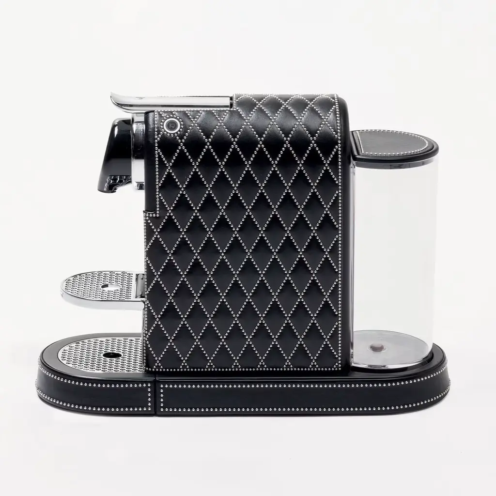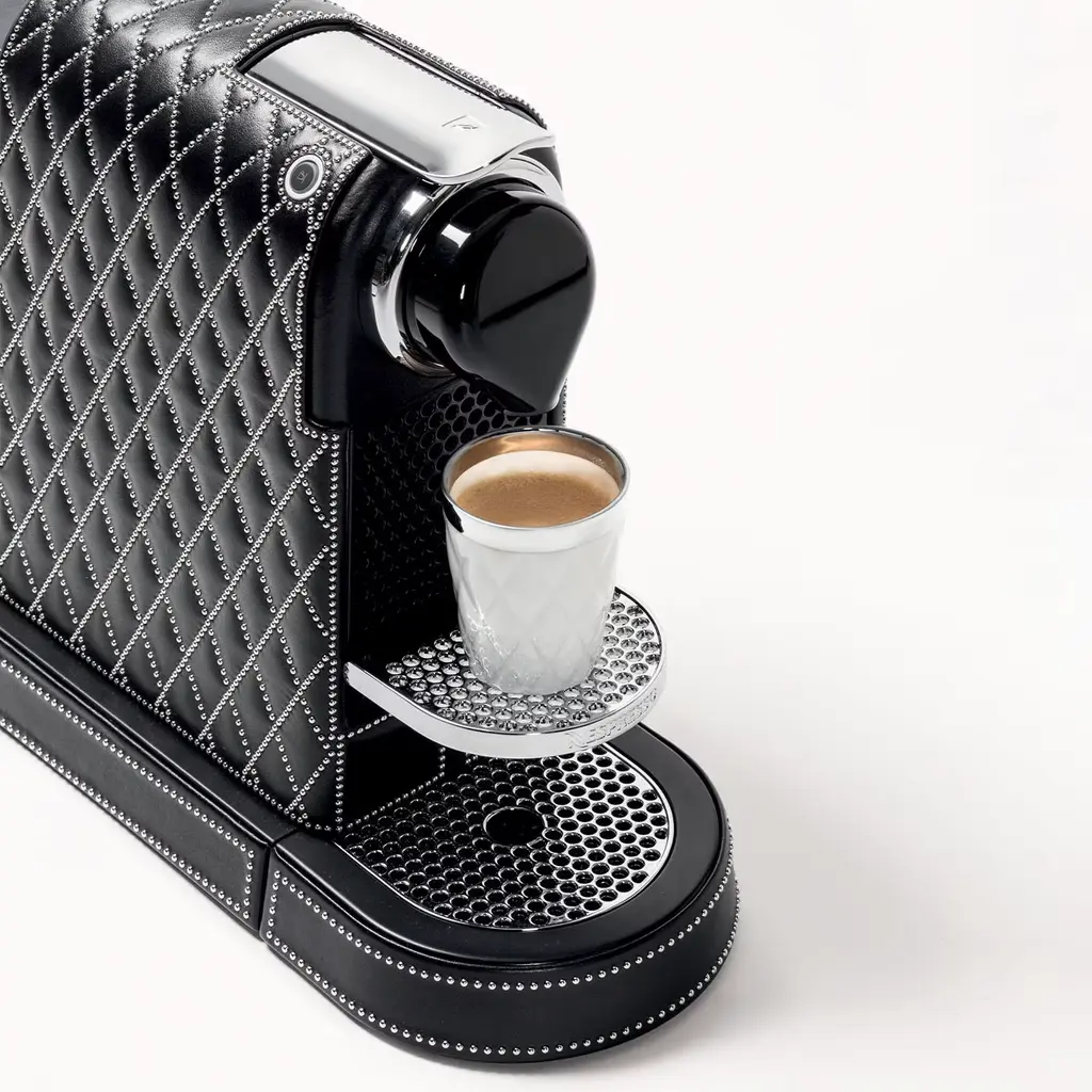 Original Nespresso machine dressed in leather with a diamond quilt pattern generated by the juxtaposition of small studs. It uses classic Nespresso capsules. Also available in the 110V version, please enquire the Concierge for more details.