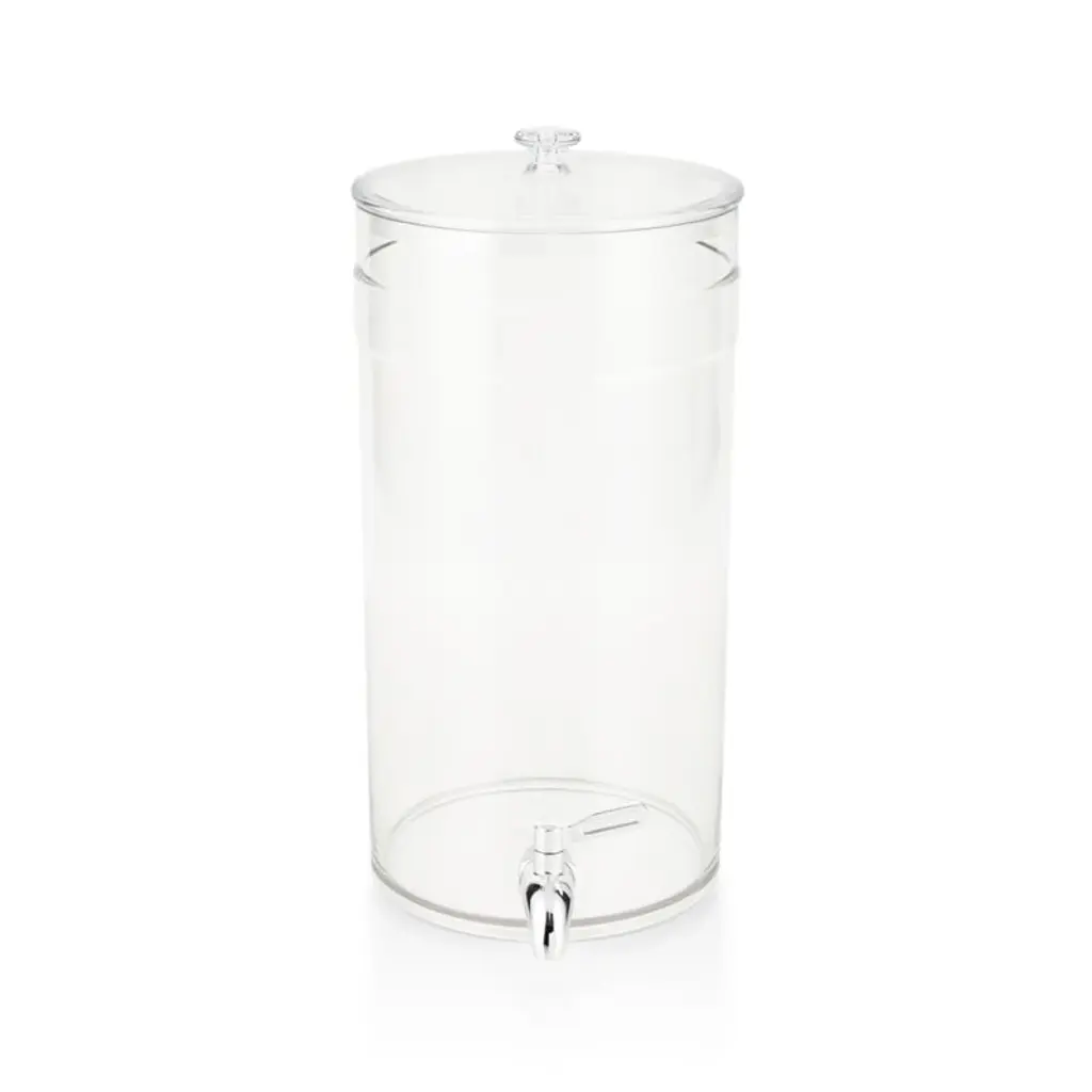 Crafted of worry-free acrylic, this drink dispenser is a festive necessity for outdoor occasions and casual gatherings. The clear dispenser shows off infused water, lemonade, punch and wine, while allowing you to easily spot when a refill is needed. A spigot ensures a perfect pour every time, and when it's time to when it's time to add more liquid or ice, simply lift the lid. Our acrylic drink dispenser sits pretty on a handsome, hand-hammered aluminum stand, elevating the dispenser so glasses can fit under the spigot.