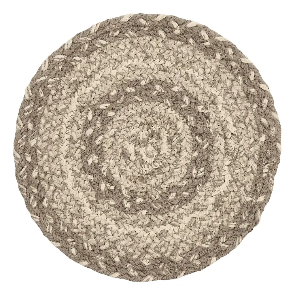 Protect your furniture in farmhouse style with our Cobblestone Jute Round Trivet. This 8 inch rustic table trivet is the perfect feature to stop heat from hot pots and pans from destroying a valued table or countertop. The homemade feel comes to life with the woven braided jute wool blend fabrics in khaki, grey taupe, and creme displayed in concentric circles. These trivets are perfect for any time of the year and can also be used as the foundation for a down-home display in any room where you want that burlap farmhouse feel. It pairs perfectly with the Cobblestone Jute Placemats, Table Runners, and Chair Pads.