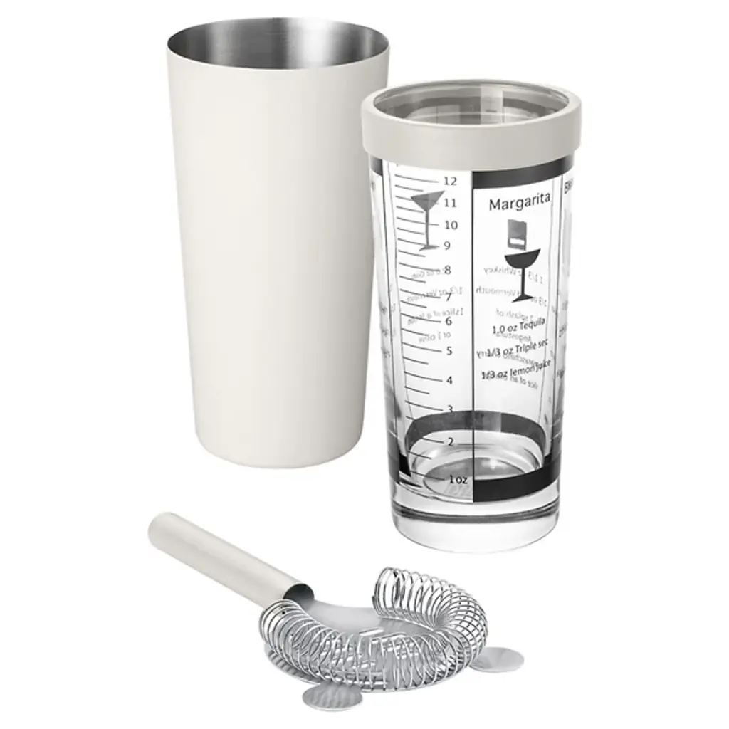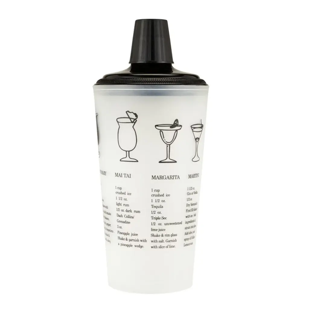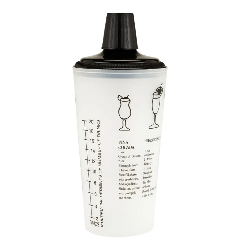Make a splash at your next gathering with the Collins 20oz Black Cocktail Shaker, the perfect balance of form and function. This isn't your average cocktail shaker - it's a fun cocktail shaker, a cute cocktail shaker, and above all, a practical cocktail shaker! Made from durable, clear plastic, it's designed to withstand even the most raucous of parties, while its large size allows you to mix up multiple drinks at once. _x000D_ _x000D_ The shaker comes with a jigger cap and a strainer lid, so you can shake, mix, and serve without needing any other bar accessories. The clear cocktail shaker allows you to see exactly what's being mixed, while the printed measurements help you get proportions just right. From a Pineapple Daiquiri to a Whiskey Sour, you'll have the perfect mix every time._x000D_ _x000D_ But the real star of the show is the recipes printed right on the side. This recipe shaker takes the guesswork out of cocktail making, letting you whip up classics like Pina Colada, Bloody Mary, Mai Tai, and Margarita with ease. And once you've mastered those, why not experiment and create your own signature cocktails? With this cocktail shaker with recipes, the possibilities are endless.
