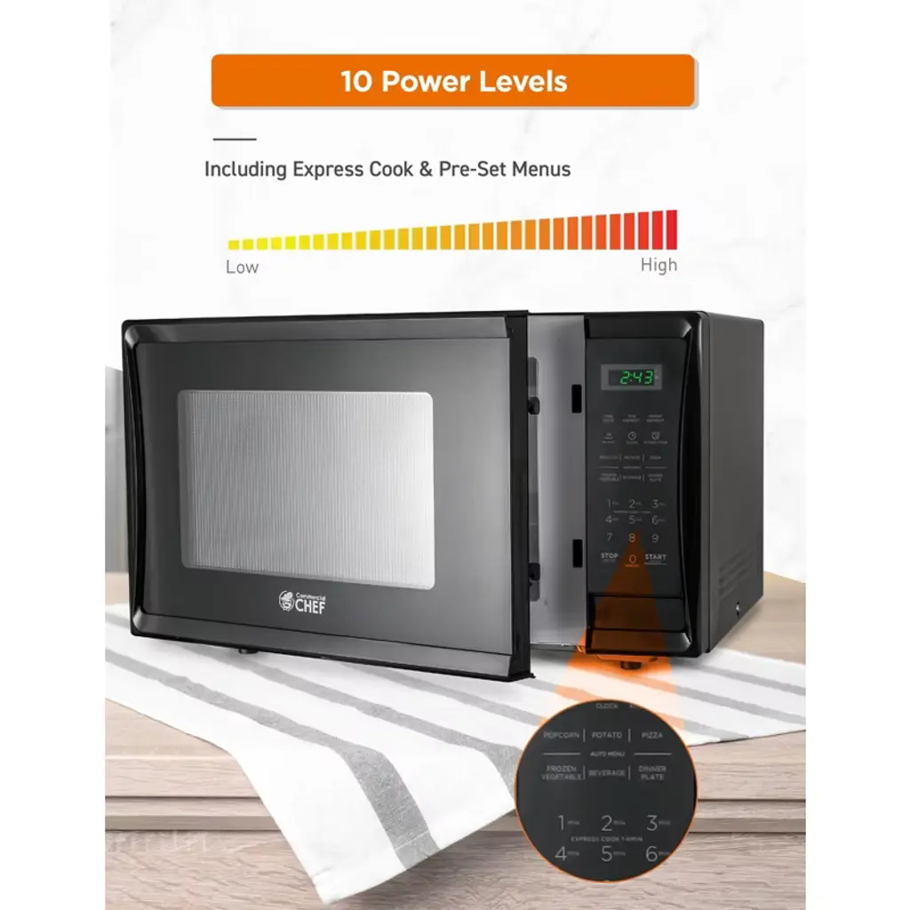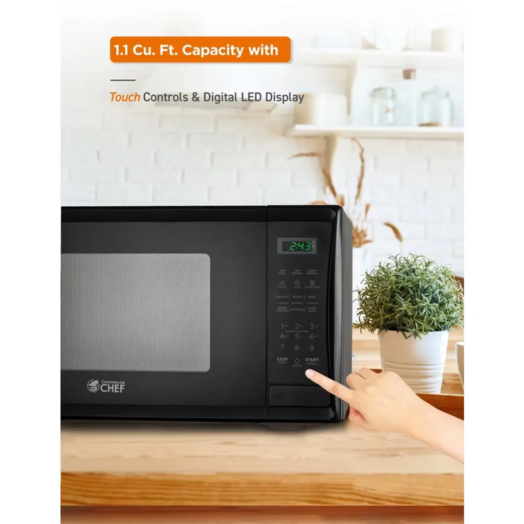 Heat and re-heat your favorite foods and beverages with this outstanding COMMERCIAL CHEF microwave oven countertop. With an impressive capacity of 1.1 cubic feet, this 1000 watt microwave oven ensures you can grab and go with delicious meals. Our fantastic microwave black (20.2" x 15.7" x 12.1") will fit easily on kitchen countertops in homes, apartments, RVs, dorms, and more. Weighing only 30.9 lbs., you can transport this portable microwave anywhere so heated food and drink is within reach. This small microwave oven has impressive power levels such as Time Cook, Time Defrost, Weight Defrost, & Power. Preset Menu Options include Popcorn, Potato, Pizza, Frozen Vegetable, Beverage, & Dinner Plate. Also included on the digital display is Clock & Kitchen Timer. Our small countertop microwave and microwave 1.1 cu ft will heat from as little as 30 seconds to as long as you desire! When it comes to microwave ovens 1000 watt, our additional features are superior, including a door-style push button, an efficient turntable that guarantees even heating, child safety lock, yellow & green LED lighting, and sleek black plastic design. What's not to love about this COMMERCIAL CHEF microwave 1000 watt countertop Its reliable heating ability, impressive functions & settings will have you heating and re-heating throughout your busy day!