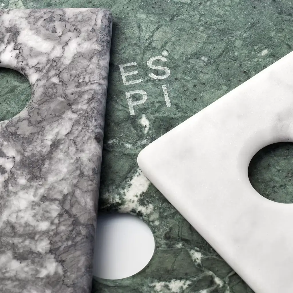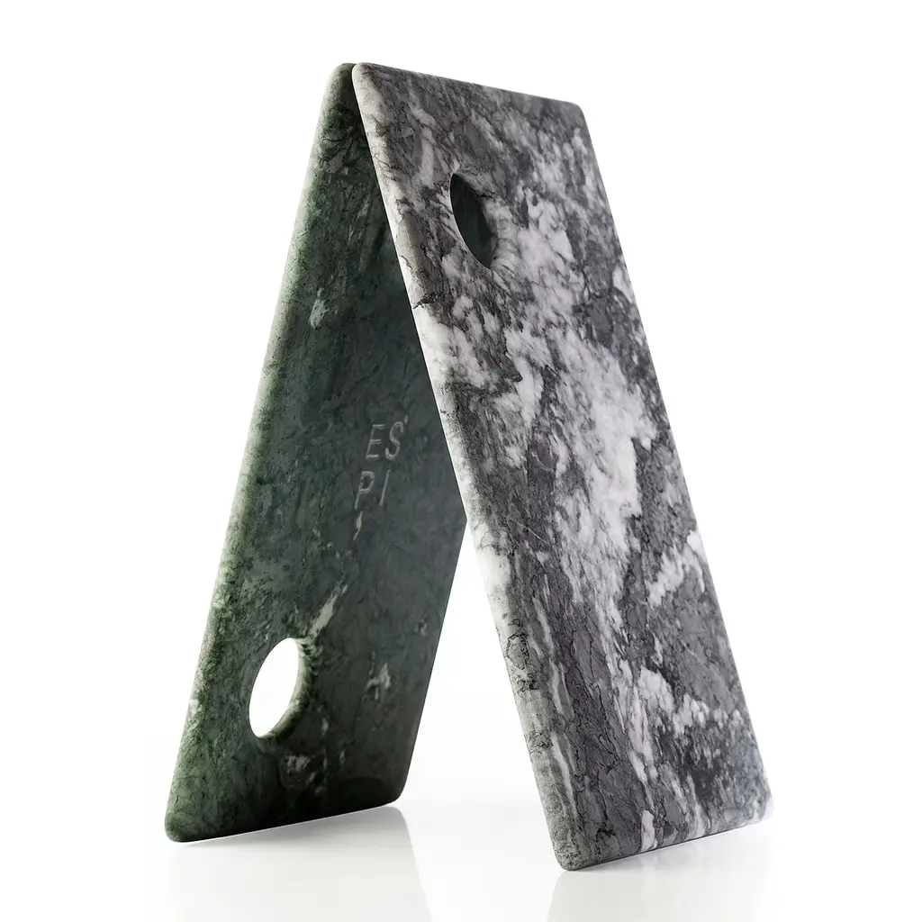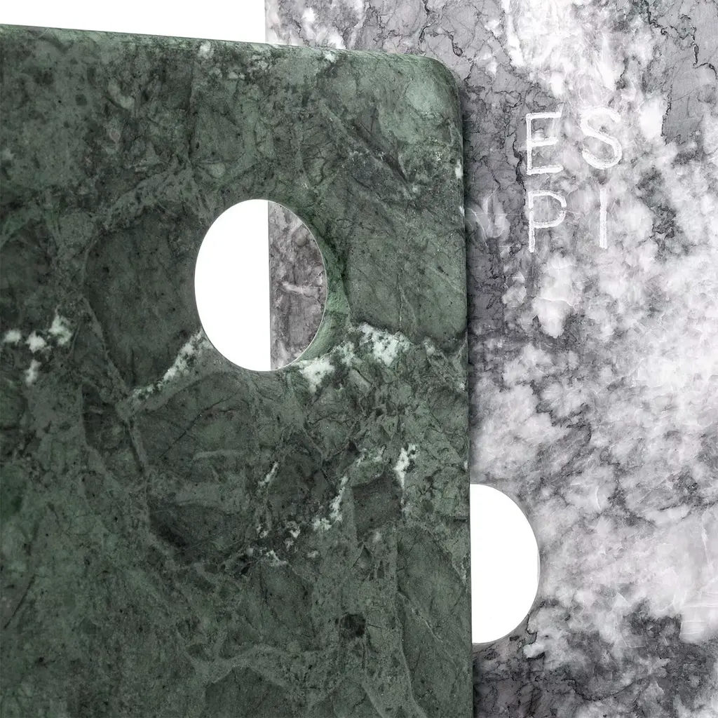 This functional work of art combines traditional form and contemporary design. Entirely handmade of stunning green Guatemala marble, the soft, rectangular silhouette and rounded edges elegantly enhance the delicate white and gray marble striations. A light design is exemplified in the trivet's subtle thickness and oversized thumbhole, allowing for easy use and presentation. Perfect as a cutting board or in the dining room for dinner presentations, this piece is sure to impress. Customization available in a wide array of marbles and hand-made engravings. Please ask the concierge for details.