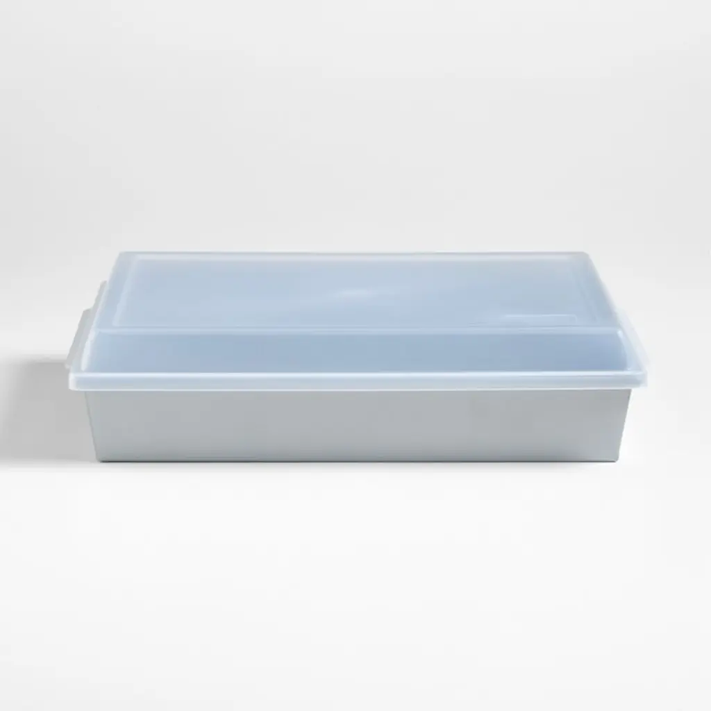 Super durable, lighter than cast iron and exclusively ours. Ideal for sheet cake, cornbread and pull-apart rolls, our silver cake pan is part of our exclusive bakeware collection that takes its cue from professional kitchens. Made of carbon steelan alloy of 99% iron and 1% carbon that's nearly indestructiblethe rectangular cake pan heats quickly and maintains consistent temperatures for perfectly baked foods. A double layer of silicone-based non-stick coating ensures easy release and quick cleanup. The sturdy lid lets you take your creations on the go or keep them fresh at home. Designed with enough height to accommodate up to two inches of frosting, the lid ensures safe transport of precious baked goods and cleans up easily in the dishwasher.