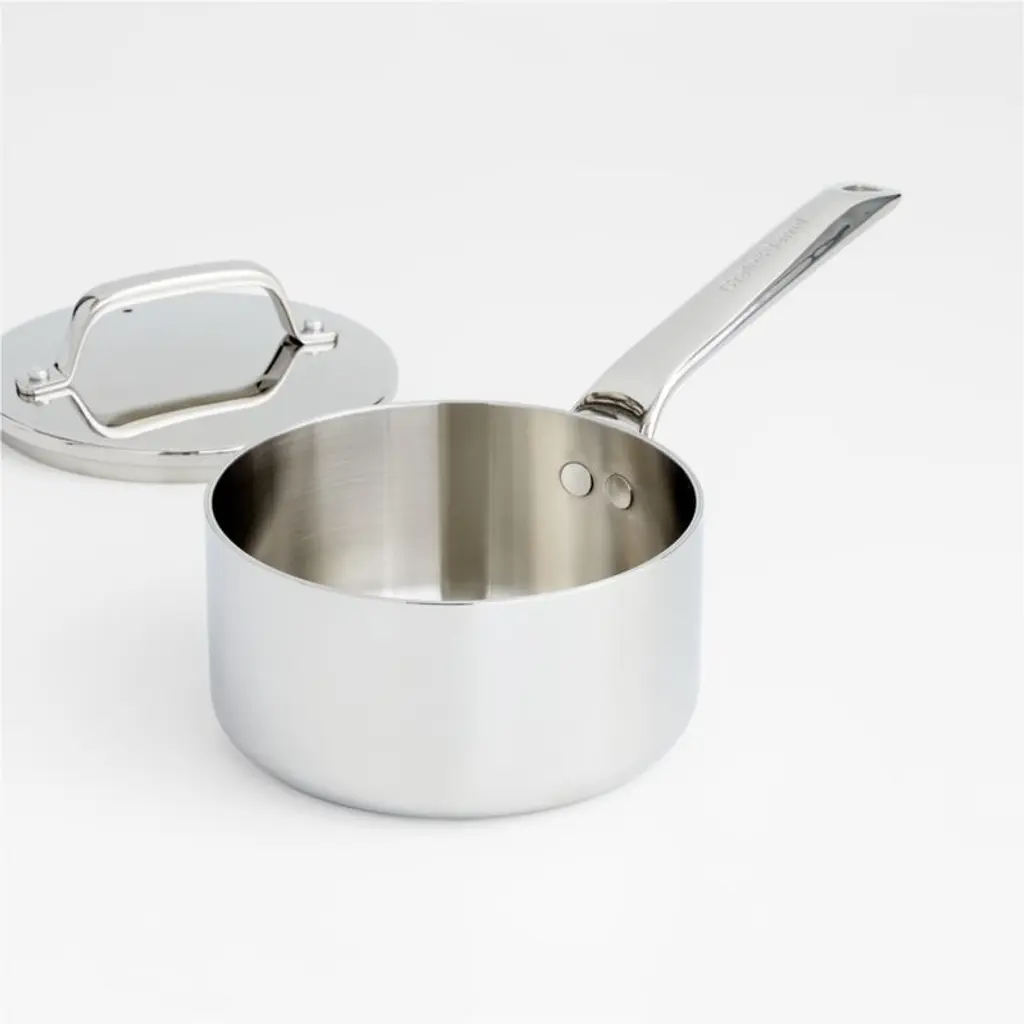 Our exclusive cookware collection has been scrutinized at every stage to bring you the heirloom quality and refined look your kitchen deserves. The saucepan's five-ply construction wraps the copper EvenCook Core in layers of aluminum and stainless steel for precision heat control and professional results. Stamped with the Crate & Barrel logo, the ergonomically considered handle feels comfortable and balanced and is secured with smooth-profile rivets for easy cleaning. Ideal for simmering and boiling, the saucepan awaits your tasty sauces, grains and sides.Direct from our design team to your kitchen, the sophisticated assortment in our signature The Kitchen by Crate line combines beautiful simplicity and peerless performance. From initial sketches to rigorous testing, every expertly designed product in this kitchen collection meets our standards, and yours.