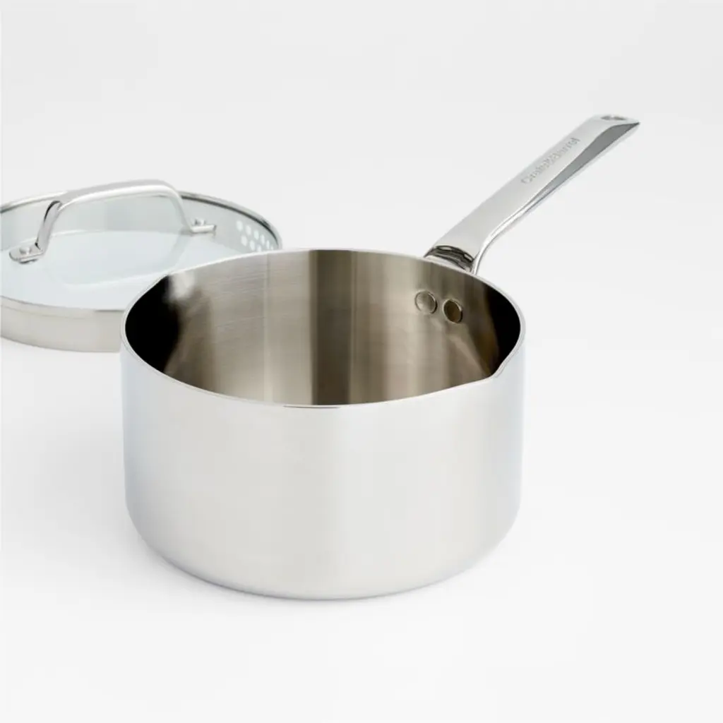 Our exclusive cookware collection has been scrutinized at every stage to bring you the heirloom quality and refined look your kitchen deserves. The saucepan's five-ply construction wraps the copper EvenCook Core® in layers of aluminum and stainless steel for precision heat control and professional results. Stamped with the Crate & Barrel logo, the ergonomically considered handle feels comfortable and balanced and is secured with smooth-profile rivets for easy cleaning. Ideal for simmering and boiling, the saucepan has a glass lid with built-in strainer that lets you keep an eye on your cooking's progress and drain pasta, vegetables and homemade stock.Direct from our design team to your kitchen, the sophisticated assortment in our signature The Kitchen by Crate line combines beautiful simplicity and peerless performance. From initial sketches to rigorous testing, every expertly designed product in this kitchen collection meets our standards, and yours.View all "The Kitchen by Crate" collection