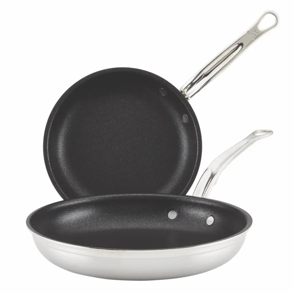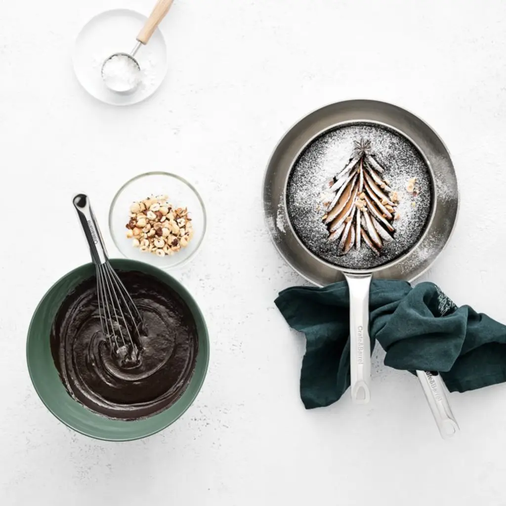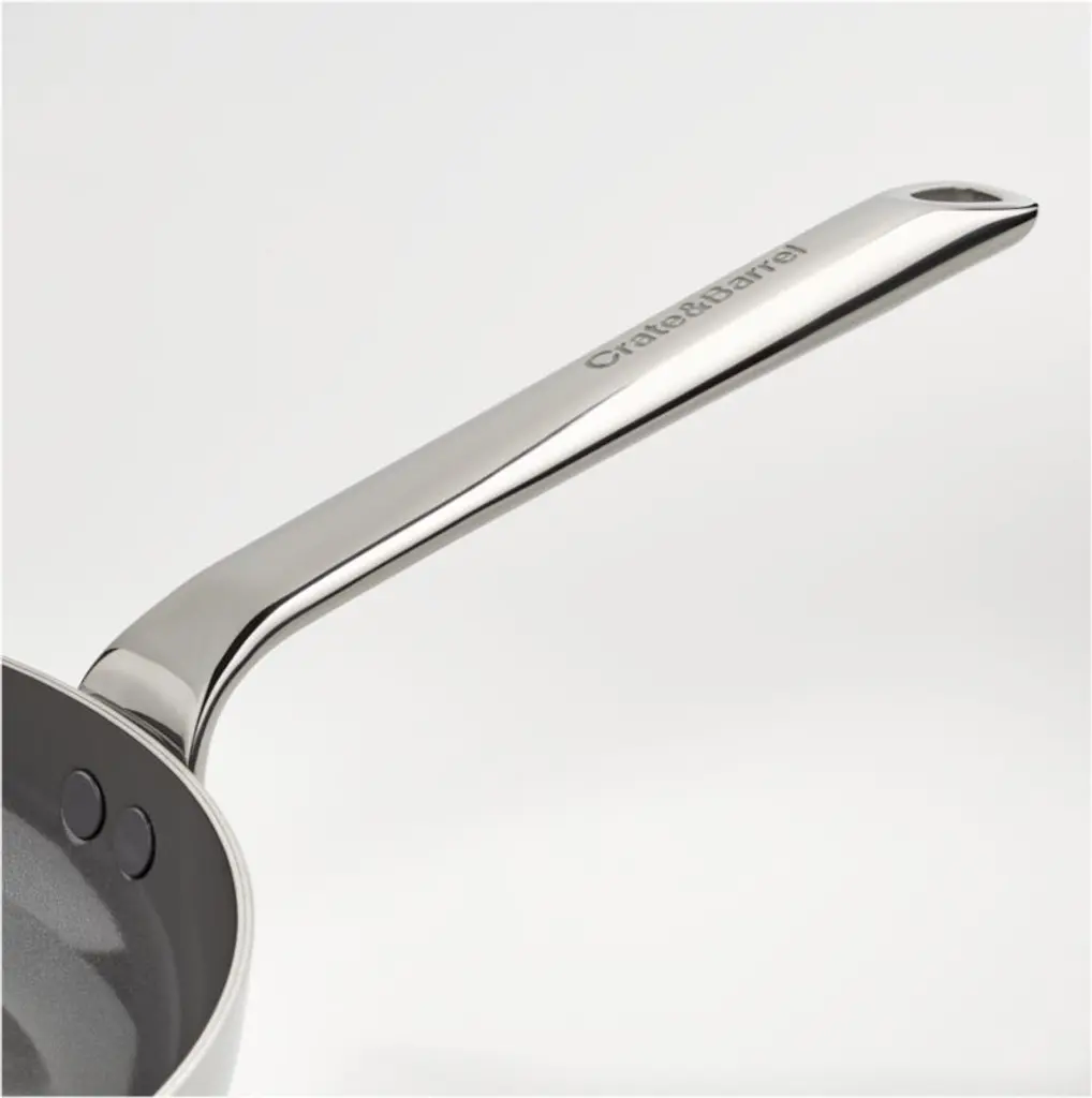 Our exclusive cookware collection has been reviewed at every stage to bring you the heirloom quality and refined look your kitchen deserves. The skillets' five-ply construction wraps the copper EvenCook Core® in layers of aluminum and stainless steel for precision heat control and professional results. The diamond-infused ceramic coating provides a non-stick cooking surface that ensures effortless food release and easy cleanup. The ergonomically considered handles stamped with the Crate & Barrel logo feel comfortable and balanced and are secured with smooth-profile rivets for easy cleaning. The set includes 8- and 10-inch frying pans that are ideal for browning and searing.Direct from our design team to your kitchen, the sophisticated assortment in our signature The Kitchen by Crate line combines beautiful simplicity and peerless performance. From initial sketches to rigorous testing, every expertly designed product in this kitchen collection meets our standards, and yours.View all "The Kitchen by Crate" collection