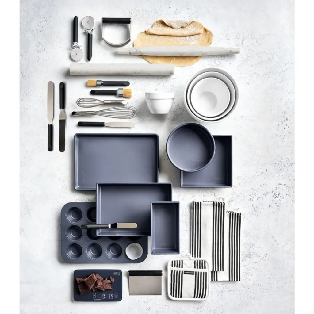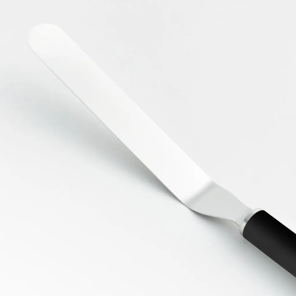 Spread and smooth buttercream, ganache, jam and meringue with our large offset icing spatula. Mirror-polished stainless steel shapes the sleek cake-decorating blade, while the soft-touch handle with a refined beveled edge provides a sturdy, comfortable grip. Combine with the other pastry tools in our exclusive Crate & Barrel collection for a well-outfitted workspace that's up to any baking challenge.Direct from our design team to your kitchen, the sophisticated assortment in our signature The Kitchen by Crate line combines beautiful simplicity and peerless performance. From initial sketches to rigorous testing, every expertly designed product in this kitchen collection meets our standards, and yours.View all "The Kitchen by Crate" collection