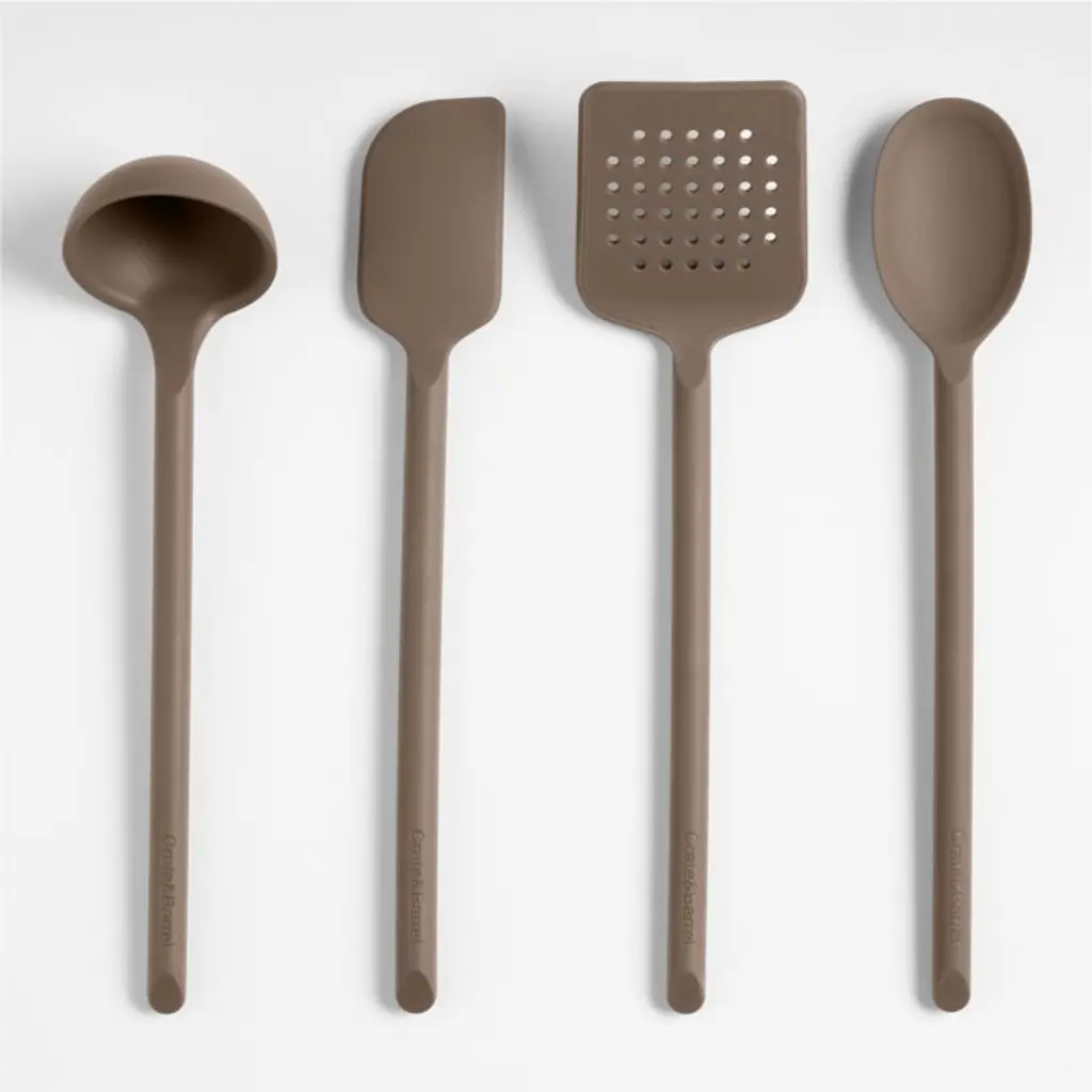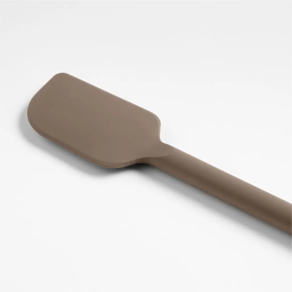Scrape every delicious bit of brownie batter, pasta sauce and rice pudding with our signature silicone spatula in warm, mushroom-inspired brown. Constructed with a nylon core for strength, the utensil ably stirs and spreads the thickest doughs, batters and nut buttersor folds delicate meringues. Its flexible, tapered edges scrape the bowl, blender or pan perfectly clean. The soft-touch silicone won't damage non-stick cookware, resists scratches and tolerates heat up to 500°F. We love the way the refined beveled edge finishes the elongated handle with a dynamic detail. Combine the dishwasher-safe spatula with the other exquisitely proportioned utensils in our exclusive Crate & Barrel collection for a well-outfitted workspace that's up to any cooking challenge.