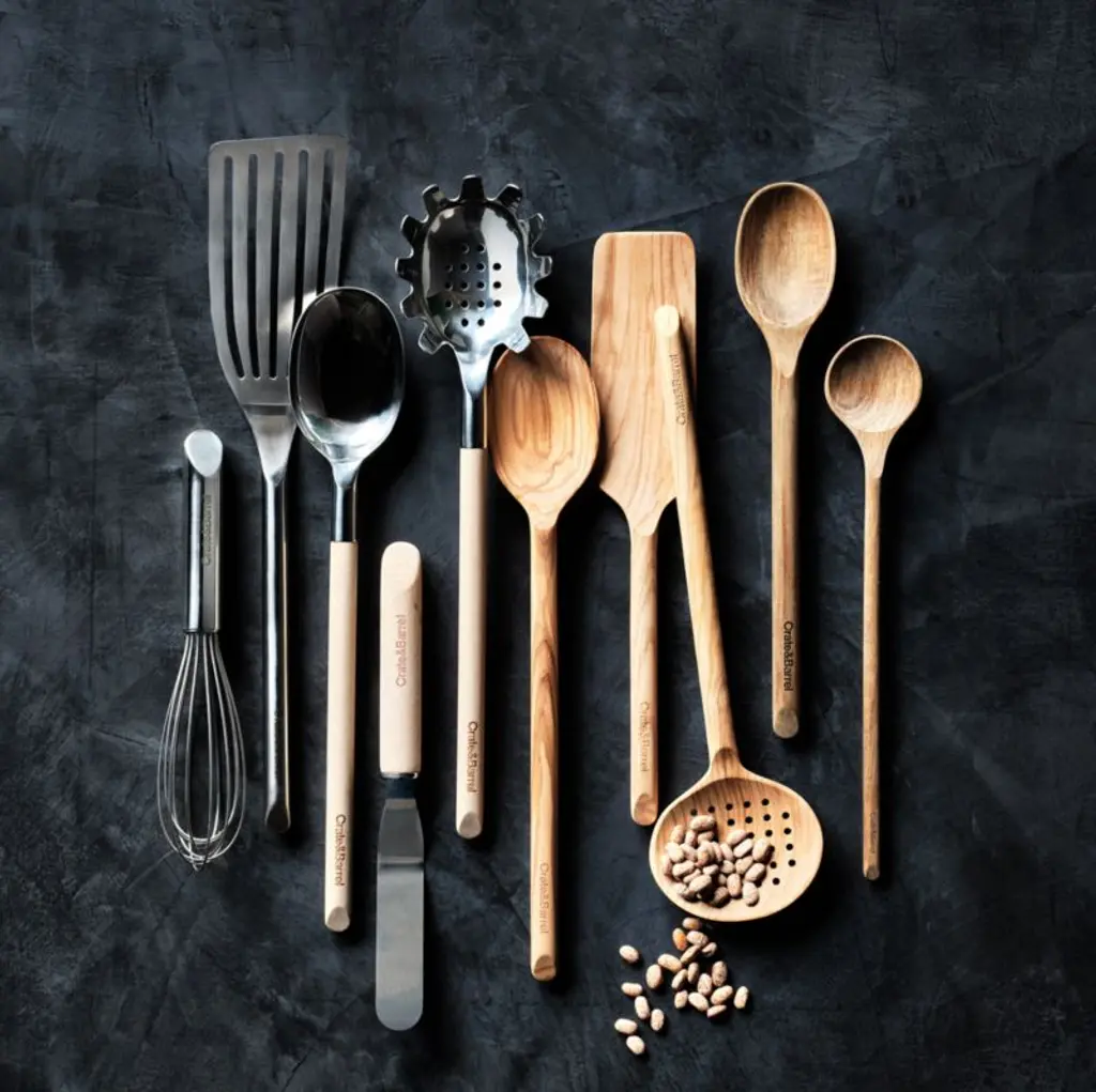 Stir, scoop, serve, scrape, flip and mix with our signature set of five olivewood utensils. The essential tools ably handle polenta, pancakes, dumplings, noodles and mashed potatoes. Showing off its flowing grain, sustainable olivewood shapes modern organic tools with a stunning look and cylindrical handles for a sturdy grip. We love the way the refined beveled edges finish the elongated handles with a dynamic detail. Exquisitely proportioned, our exclusive Crate & Barrel utensil set includes a spoon, slotted spoon, pasta spoon, solid turner and spurtle turner for a well-outfitted workspace that's up to any cooking challenge.Direct from our design team to your kitchen, the sophisticated assortment in our signature The Kitchen by Crate line combines beautiful simplicity and peerless performance. From initial sketches to rigorous testing, every expertly designed product in this kitchen collection meets our standards, and yours.View all "The Kitchen by Crate" collection