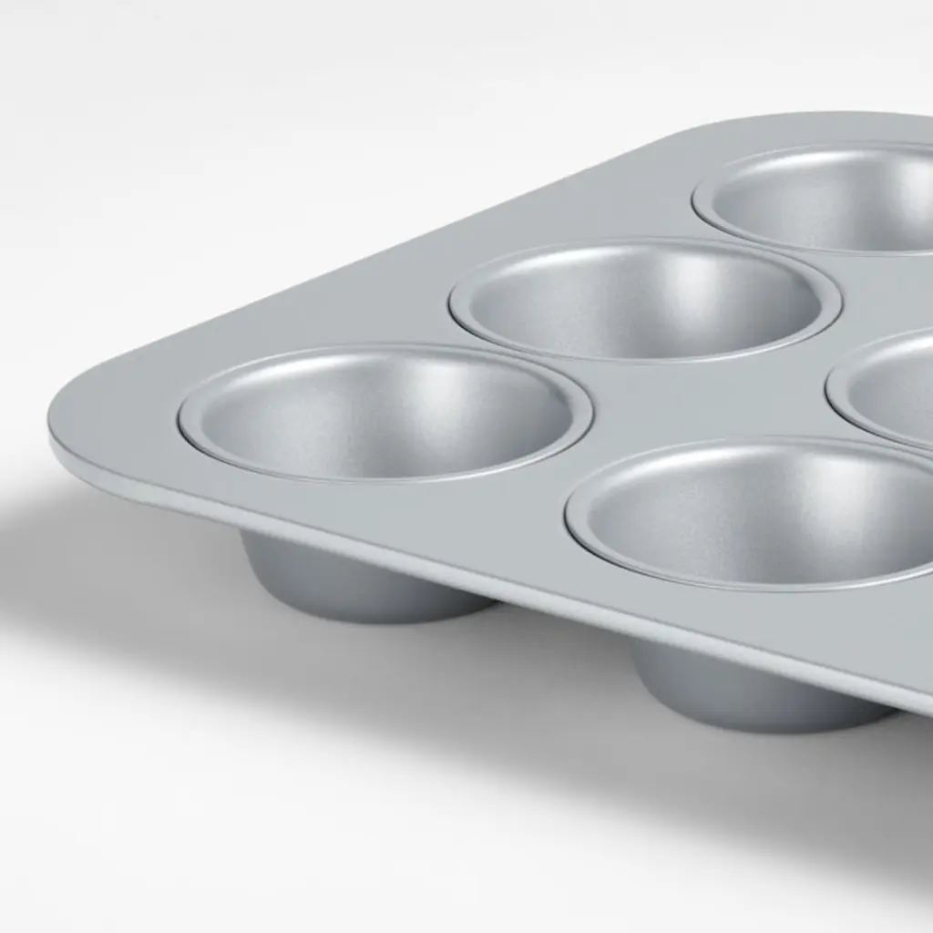 Super durable, lighter than cast iron and exclusively ours. Perfect for baking cupcakes, muffins or mini quiches, our silver 12-cup muffin pan is part of our bakeware collection that takes its cue from professional kitchens. Made of carbon steelan alloy of 99% iron and 1% carbon that's nearly indestructiblethe pan heats quickly and maintains consistent temperatures for perfectly browned baked goods. A double layer of silicone-based non-stick coating ensures easy release and quick cleanup.View all "The Kitchen by Crate" collection