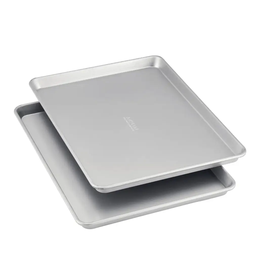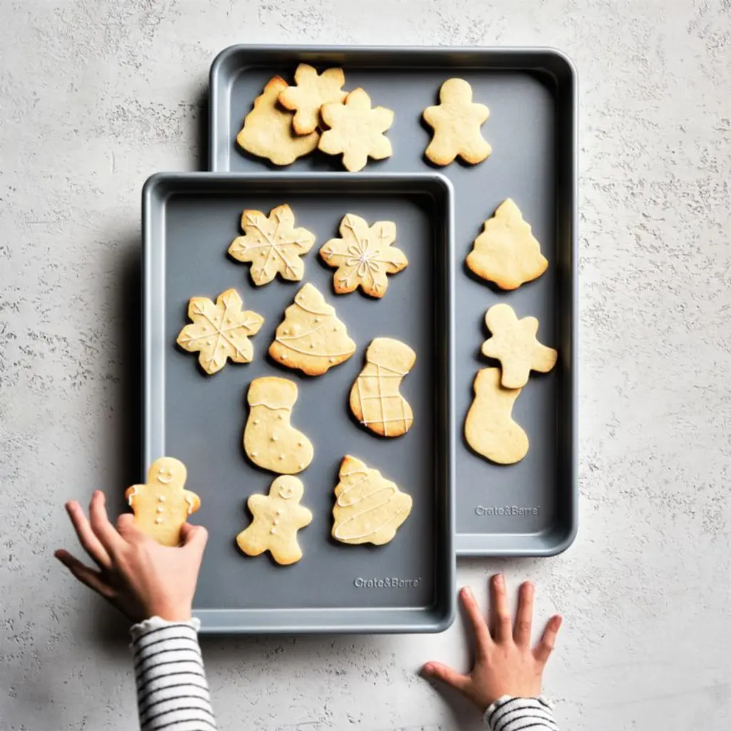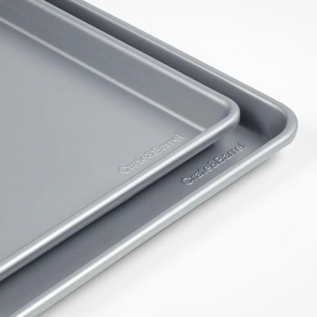 Super durable, lighter than cast iron and exclusively ours. Perfect for batches of cookies and one-pan meals, our set of silver sheet pans is part of our exclusive bakeware collection that takes its cue from professional kitchens. Made of carbon steelan alloy of 99% iron and 1% carbon that's nearly indestructiblethe two baking sheets heat quickly and maintain consistent temperatures for perfectly browned and crisped foods. A double layer of silicone-based non-stick coating ensures easy release and quick cleanup.View all "The Kitchen by Crate" collection