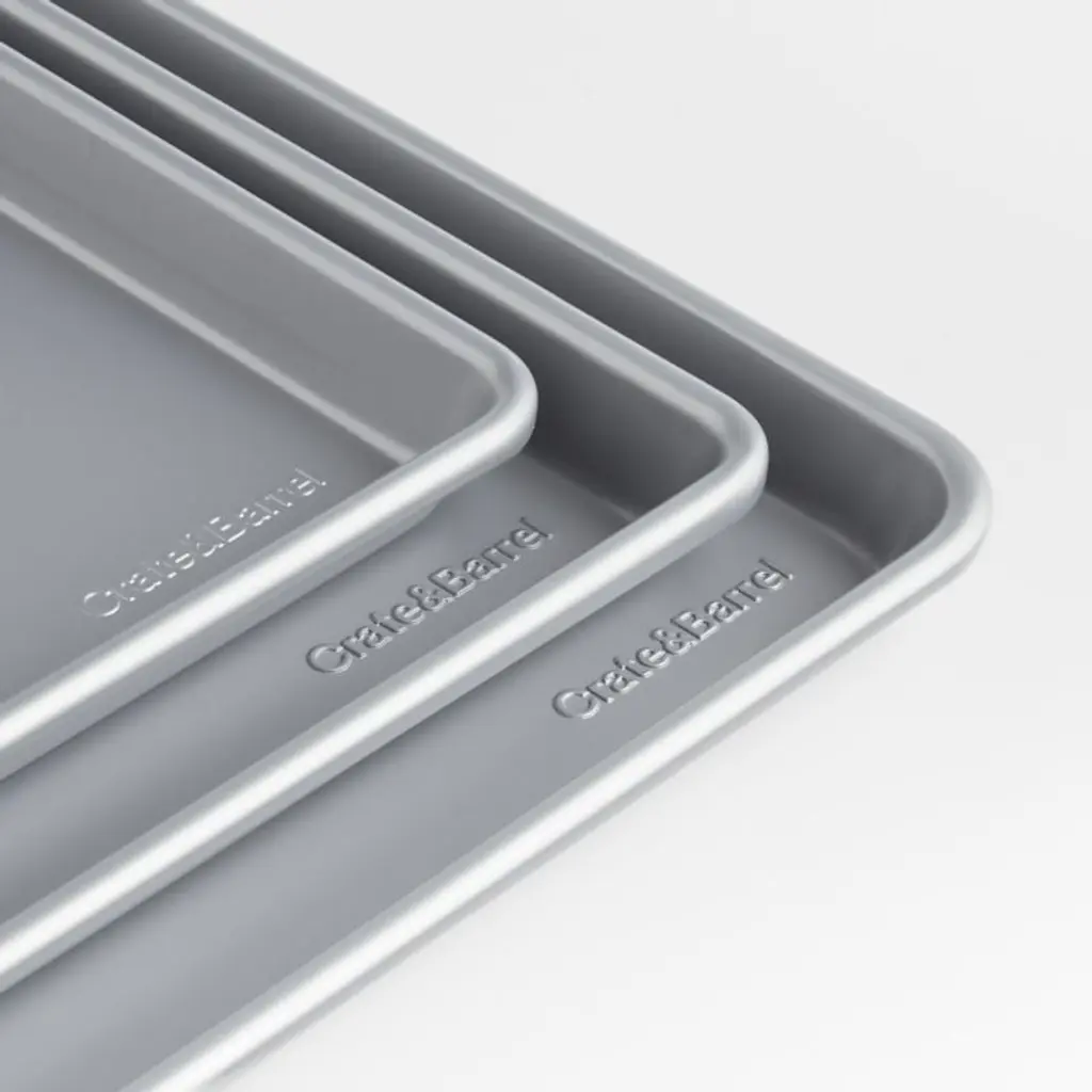 Super durable, lighter than cast iron and exclusively ours. Perfect for batches of bar cookies, one-pan meals and Swiss rolls, our baking sheet set is part of our bakeware collection that takes its cue from professional kitchens. Made of carbon steelan alloy of 99% iron and 1% carbon that's nearly indestructiblethe three baking sheets heat quickly and maintain consistent temperatures for perfectly browned and crisped foods. Double layers of silicone-based non-stick coating ensure easy release and quick cleanup. A useful housewarming or engagement giftor an anytime present for your favorite bakerthis set includes a silver quarter sheet pan, half sheet pan and jelly roll pan.View all "The Kitchen by Crate" collection