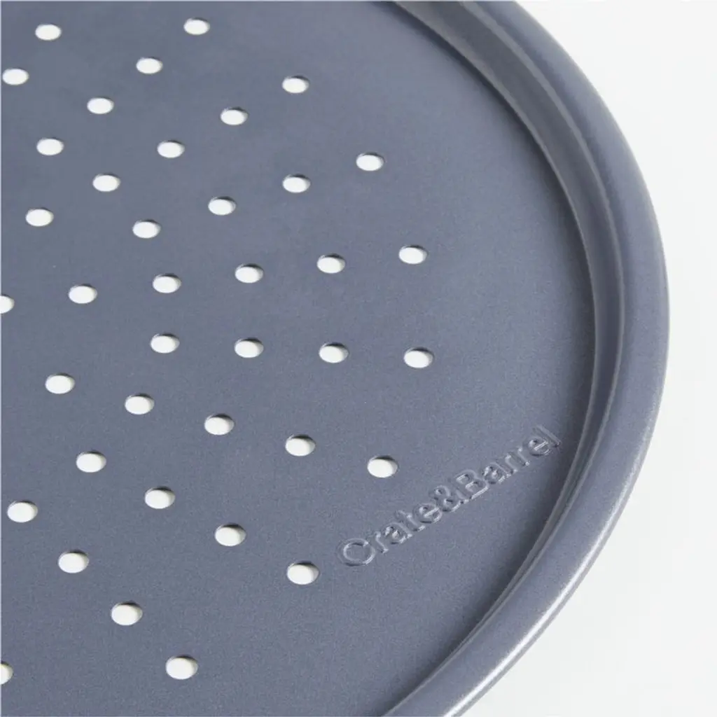 Super durable, lighter than cast iron and oh, that gorgeous unexpected blue. Perfect for thin-crust pizzas, our slate blue pizza pan is part of our bakeware collection that takes its cue from professional kitchens. Made of carbon steelan alloy of 99% iron and 1% carbon that's nearly indestructiblethe pan heats quickly and evenly for consistent baking and perfect browning. Perforations allow for greater airflow and crispier crusts, and a double layer of silicone-based non-stick coating ensures easy release and quick cleanup. Pair with our other exclusive slate blue pans to build a versatile baking collection that's ready for any recipe.View all "The Kitchen by Crate" collection