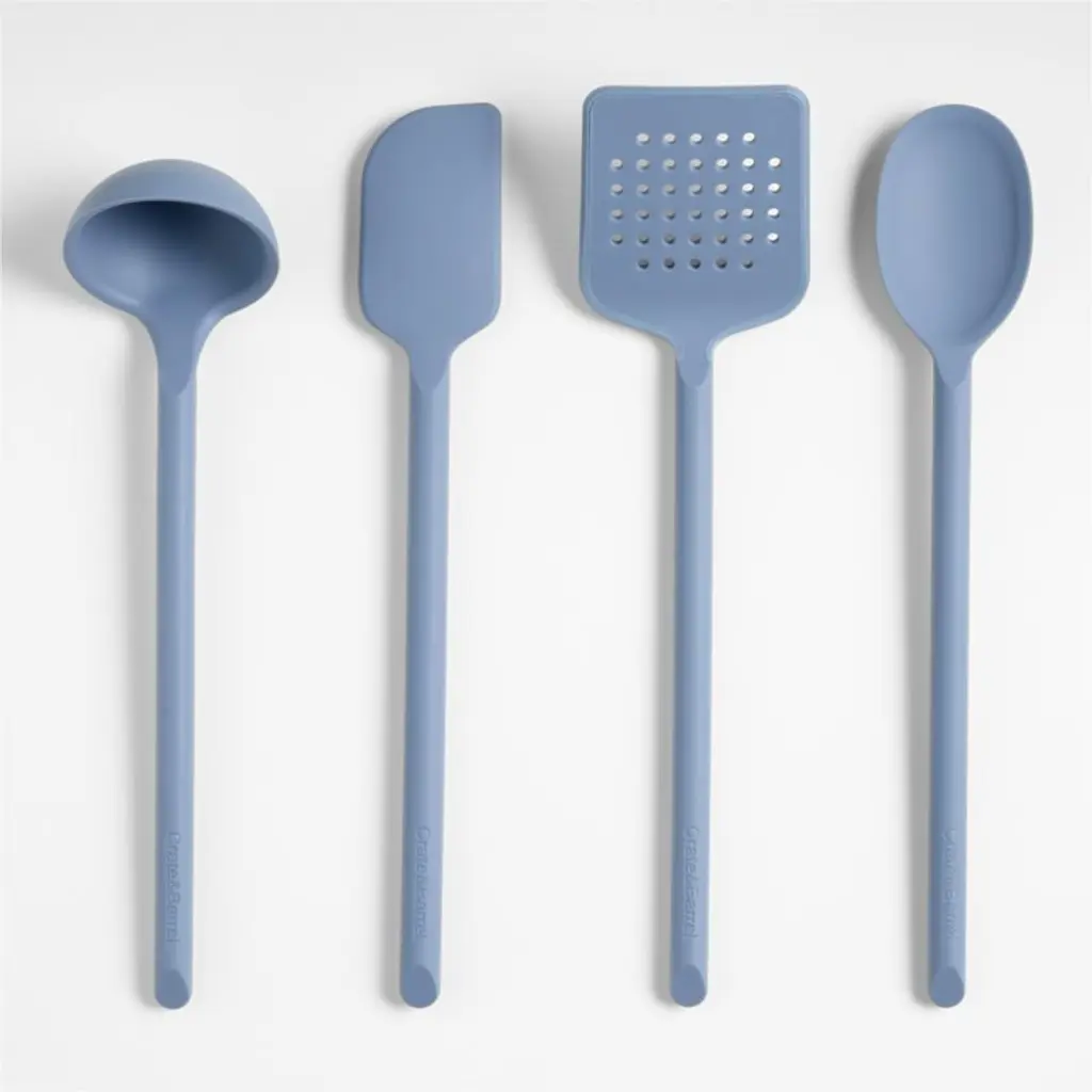 Soft-touch, heat-resistant and oh, that gorgeous slate blue. Scrape every delicious bit of brownie batter, pasta sauce and rice pudding with this silicone spatula that coordinates beautifully with our signature cookware and bakeware in the same hue. Constructed with a nylon core for strength, the utensil ably stirs and spreads the thickest doughs, batters and nut buttersor folds delicate meringues. Its flexible, tapered edges scrape the bowl, blender or pan perfectly clean without damaging non-stick finishes. We love the way the refined beveled edge finishes the elongated handle with a dynamic detail. Combine the dishwasher-safe spatula with the other exquisitely proportioned utensils in our exclusive Crate & Barrel collection for a well-outfitted workspace that's up to any cooking challenge.