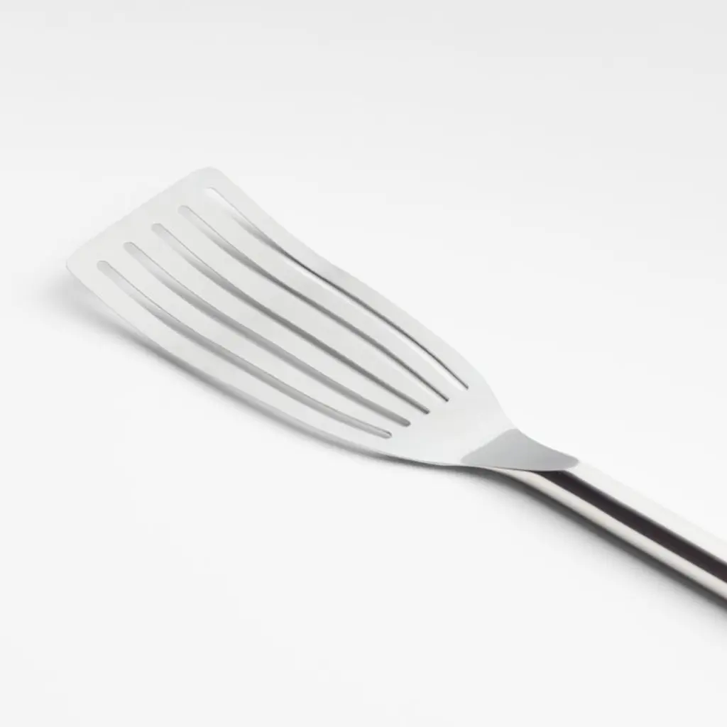 Flip and serve salmon fillets, whole sea bass and crab cakes with our signature stainless steel fish turner. With a flexible head that makes it ideal for handling delicate fish, the utensil also ably turns and lifts a roasted trout, hearty potato pancake or fried egg. The slender slots allow liquids to drain away. Polished stainless steel shapes a sleek spatula with a cylindrical handle for a sturdy grip and a professional look. We love the way the refined beveled edge finishes the elongated handle with a dynamic detail. Combine the dishwasher-safe turner with the other exquisitely proportioned utensils in our exclusive Crate & Barrel collection for a well-outfitted workspace that's up to any cooking challenge.View all "The Kitchen by Crate" collection