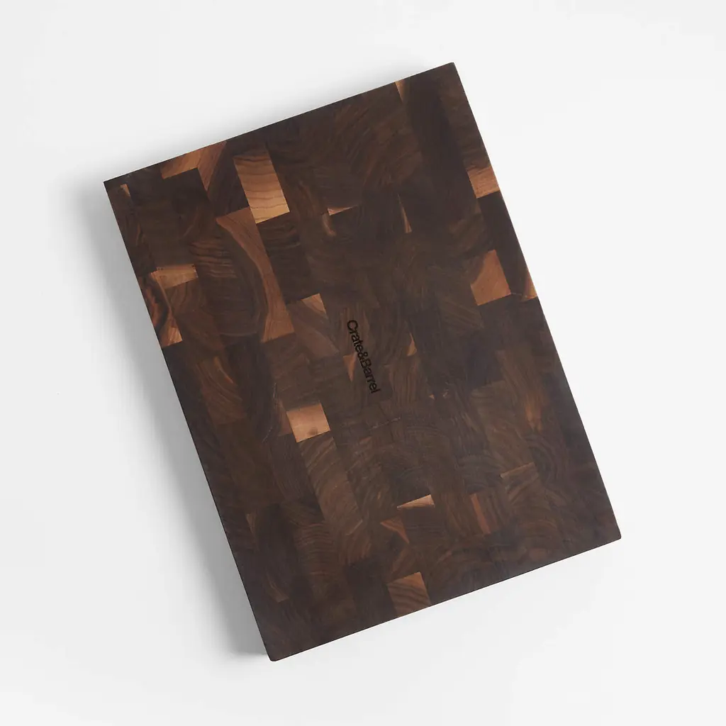 The intentionally simple designs of our signature Crate & Barrel cutting boards keep all the attention on the beauty of wood. Crafted from walnut, the end-grain board showcases the wood's dark drama and fine, tight grain in a mosaic of deep tones. Carved finger indentations provide an easy handhold as you pass appetizers, transfer chopped ingredients to a pan or carry your stunning charcuterie from the kitchen. The thick, butcher block-style board stands up to everyday use. Modern yet timeless, our display-worthy board offers versatility, durability and classic good looks. Each of our exclusive end-grain walnut cutting boards is beautifully unique.