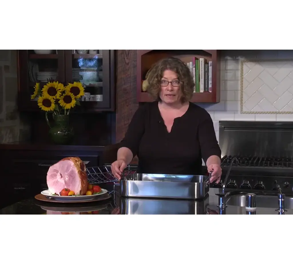 Rack is big enough for a turkey and perfect for a roast. This pan comes with its own stainless steel rack with large easy-grip handles. It fits into any standard oven and it is stove top and induction safe, which means gravies and sauces can be made from the drippings right in the pan!