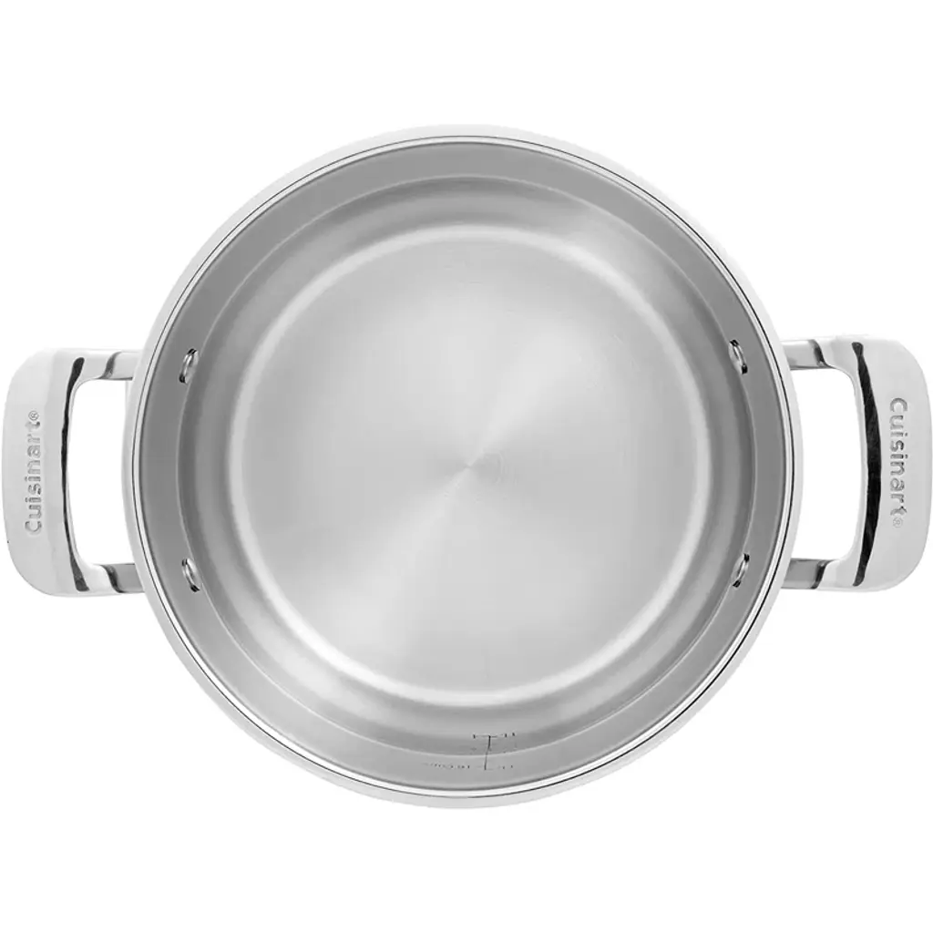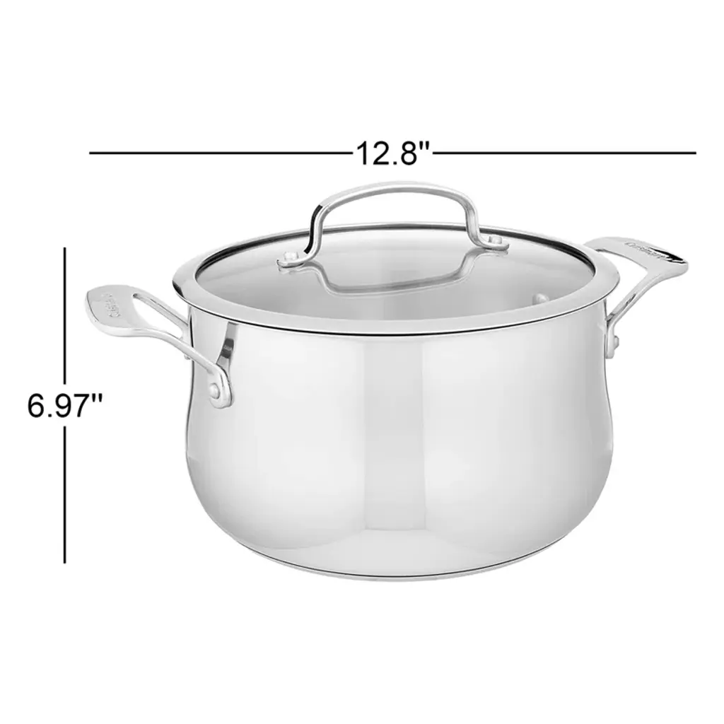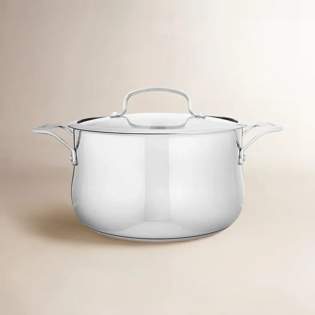 Cuisinart's Contour Stainless 5 Qt. Dutch Oven with Tempered Glass Cover is ideal for simmering, boiling, and stewing, keeping food moist and full of flavor. Contour Stainless cookware features professional construction offering unsurpassed performance. The aluminum encapsulated base maintains even heat distribution, eliminating hot spots, plus the premium stainless steel cooking surface does not react with food or alter natural flavors. The sleek, flat tempered glass lid with stainless steel trim seals in moisture and flavor. Contour's elegant styling and robust silhouette make for a unique, professional look. With this versatile Dutch Oven, you'll cook with added flair!