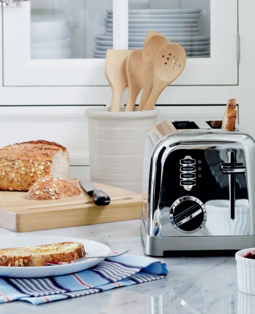 Modern function with a retro, commercial look for your kitchen counter. Features include six-setting browning dials, 1½"-wide slots, lift-lever for small items, slide-out crumb tray, defrost and bagel buttons with LED indicators.