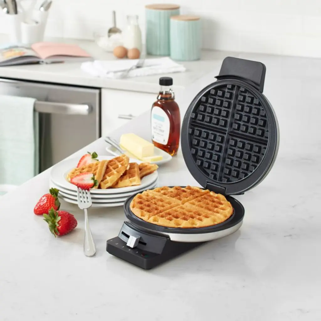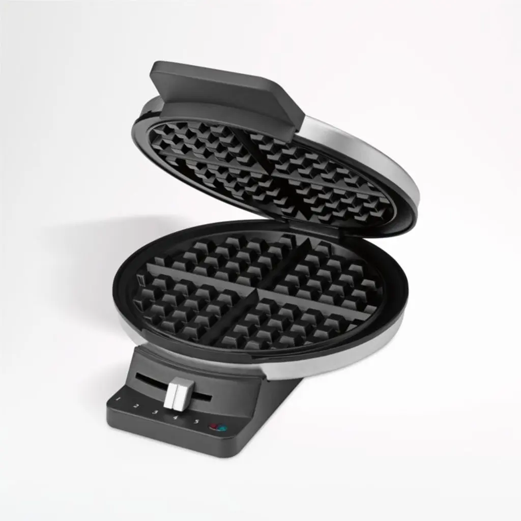 Make every waffle exactly to your liking with this brushed stainless steel waffle maker. Weighted plates ensure even cooking, five browning levels let you select your ideal level of doneness and non-stick baking plates release finished waffles easily. For worry-free waffling, the red light indicates when the plates are properly heated and the green light illuminates when your waffle is ready to eat.Cuisinart has been creating inventive and accessible kitchen appliances, cookware and accessories for nearly 50 years.