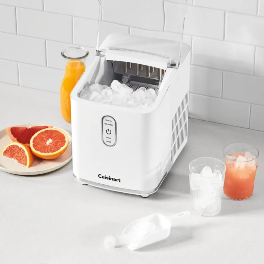 Flawlessly formed cubes are yoursup to 26 pounds per day, This compact appliance makes ice rapidly and steadily. Indicators let you know when the petite white ice maker is full of ice or low on water, and the included scoop makes it easy to add cubes to drinks, coolers, cocktail shakers or water bottles.Cuisinart has been creating inventive and accessible kitchen appliances, cookware and accessories for over 50 years.
