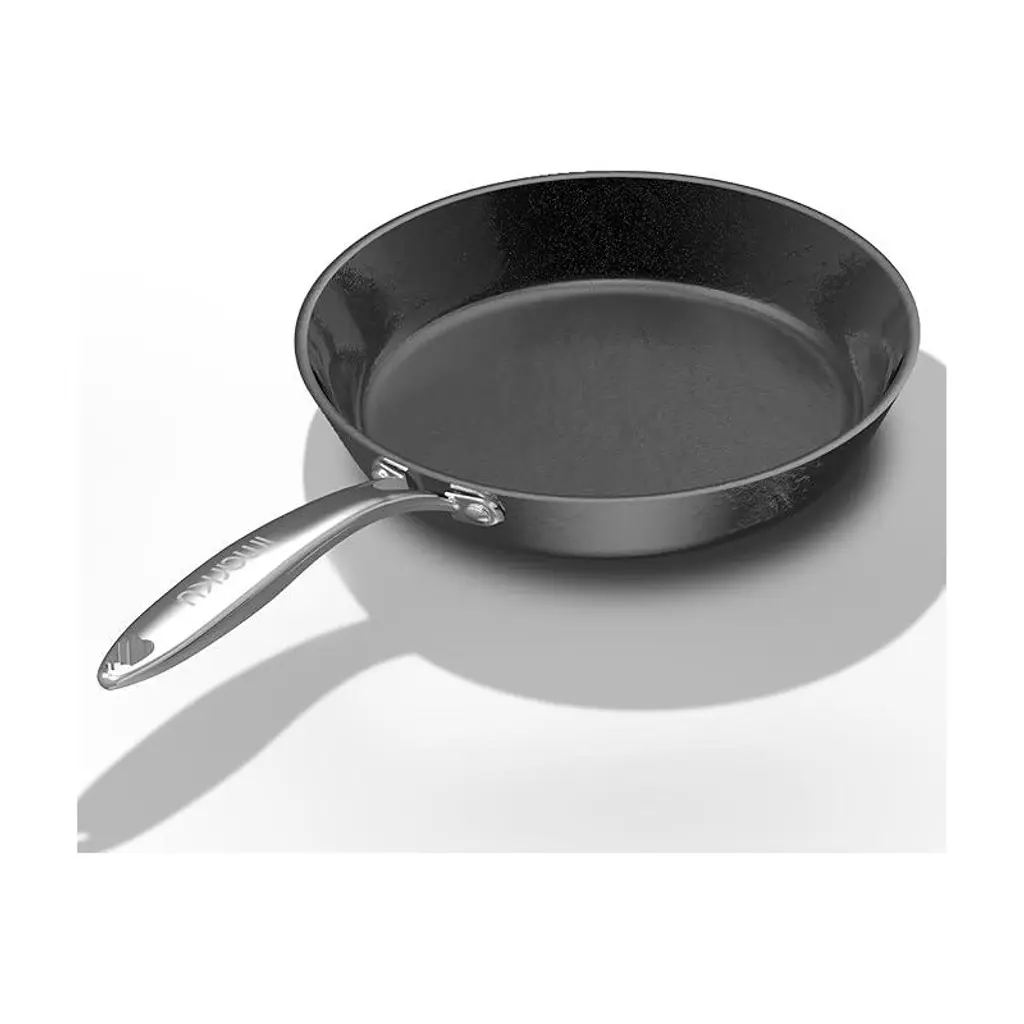 The Culinary Collection from Cuisinart boasts beautifully contoured cookware with ceramic cooking surfaces and comfortable handles. This aluminum skillet's glossy black exterior pairs handsomely with the grey non-stick interior. Crafted of stay-cool stainless steel, the ergonomic handle sculpted with finger grips makes it easy to move the pan from stovetop to oven to table.Cuisinart has been creating inventive and accessible kitchen appliances, cookware and accessories for over 50 years.