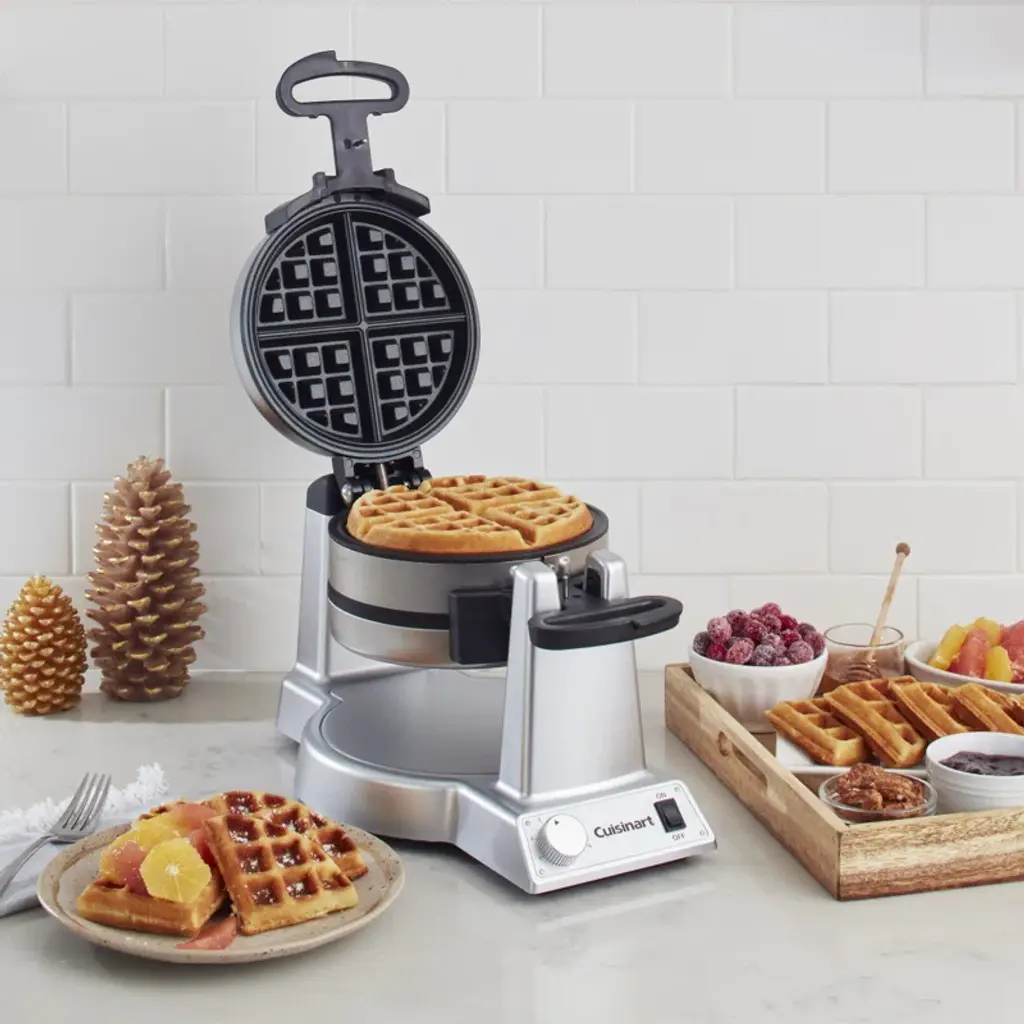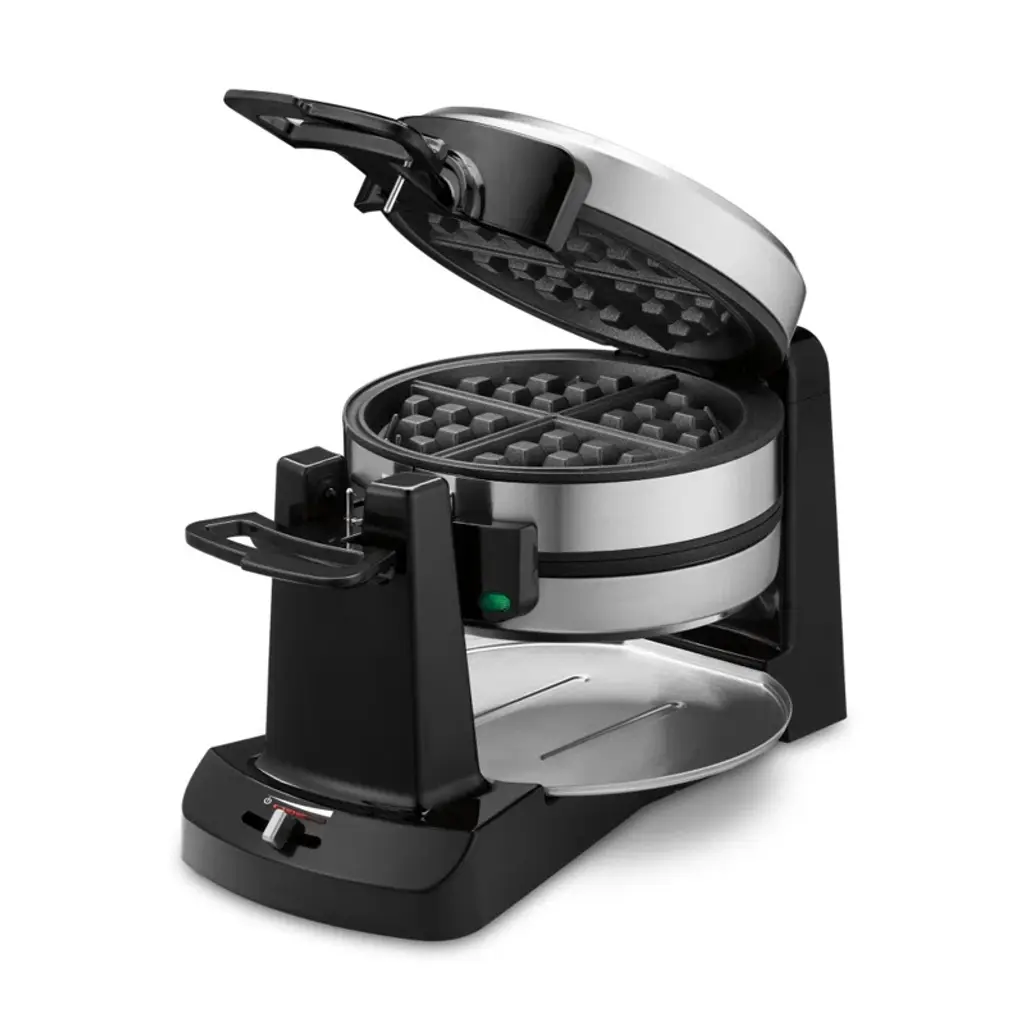 Whip up delicious, evenly cooked Belgian waffles for breakfast with this double Belgian waffle maker. Its 180-degree rotary feature ensures a perfect bake on both sides, while the 1400-watt power helps you create fluffy or crispy waffles in minutes. The browning control dial lets you customize the cook to your preference, and the non-stick plates make for easy release and cleanup. Plus, the ready indicator light and beeping alert prevent over- or under-cooking. With its sleek stainless steel housing, this waffle maker is a modern addition to any kitchen.