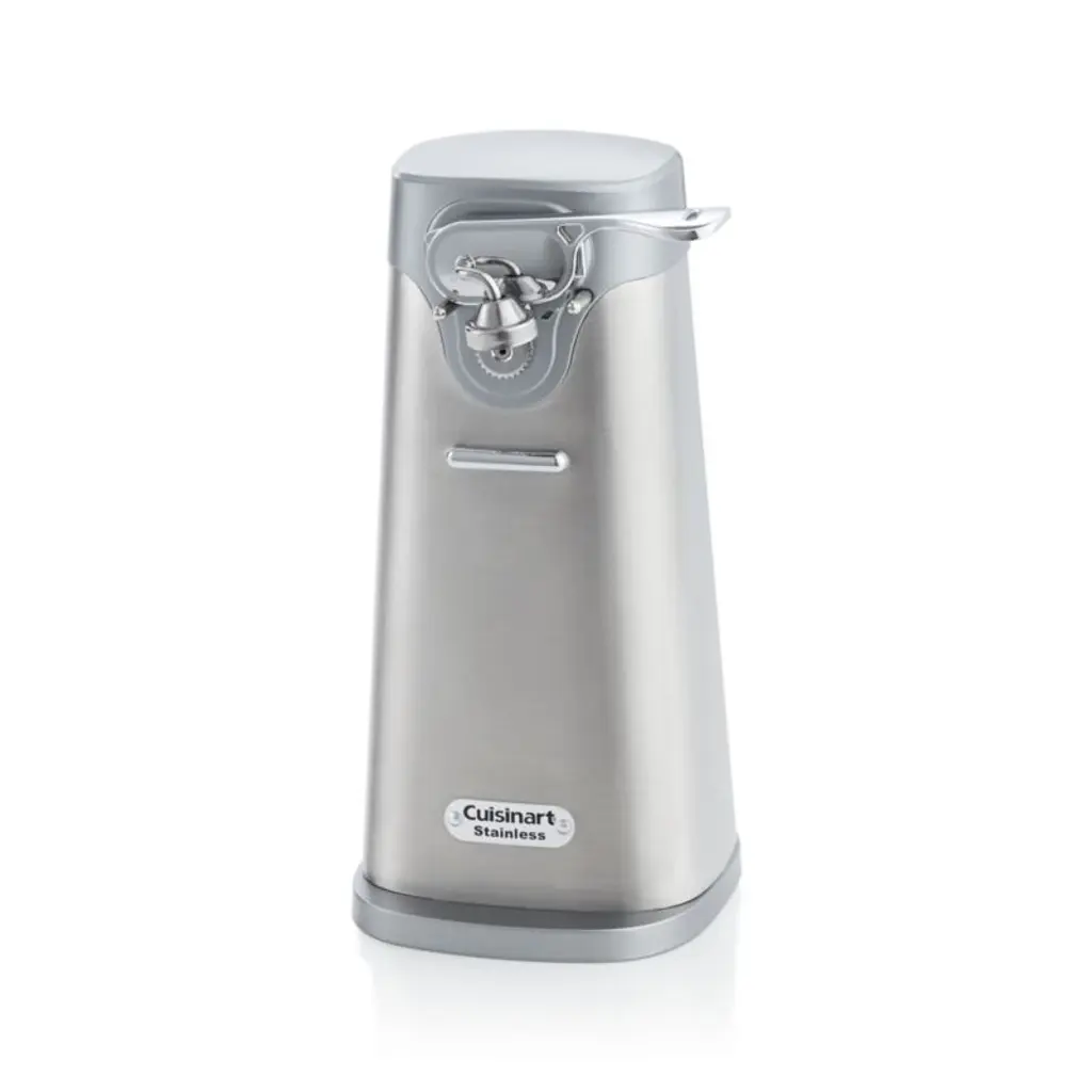 Able to hold its own with today's premium countertop appliances, Cuisinart's smartly styled electric can opener features a sleek tapered design in brushed stainless steel and easy, one-touch operation. Freestanding device with extra-wide base for stability and "press-and-release" lever makes opening any size can effortless. A precision power cut blade and handy magnetic lid holder are attached to the removable arm, making cleanup a breeze.
