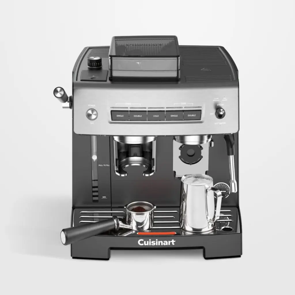 "An espresso bar at home. This semi-automatic machine offers 16 grinding levels and a tamper-assist feature that tamps grounds evenly and consistently to ensure optimal extraction. Pull single or double shots of espresso into the pre-warmed vessel of your choice, from an espresso cup to a large travel mug. Enjoy the concentrated brew as is, or use the steam wand to create luscious froth for lattes and cappuccinos or to add hot water for Americanos. For a refreshing iced drink, choose the ingenious cold extraction option.Cuisinart has been creating inventive and accessible kitchen appliances, cookware and accessories for over 50 years.