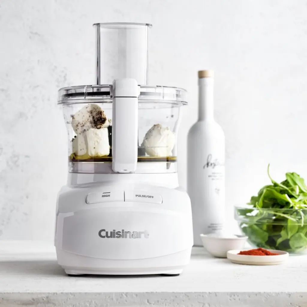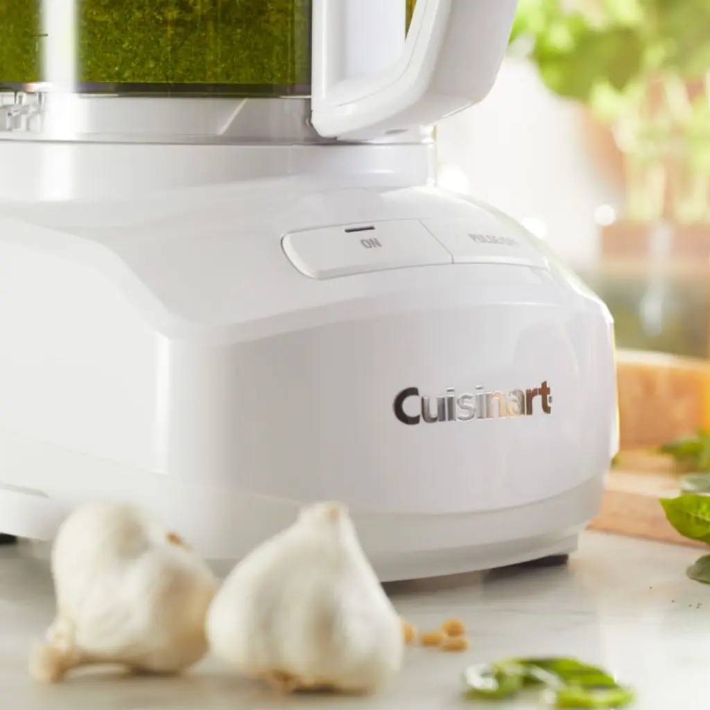 This kitchen workhorse speeds along prep and cooking, with a powerful motor for making quick meals, weeknight dinners or weekend celebrations. With a small countertop footprint in bright white, the processor features a work bowl that can accommodate generous batches of salsa, hummus, bread dough or slaw. The reversible slicing disc, reversible shredding disc and multi-purpose blade nest together in a removable storage hub. Simple controls and a sleek design streamline operation in this versatile food processor.Cuisinart has been creating inventive and accessible kitchen appliances, cookware and accessories for over 50 years.